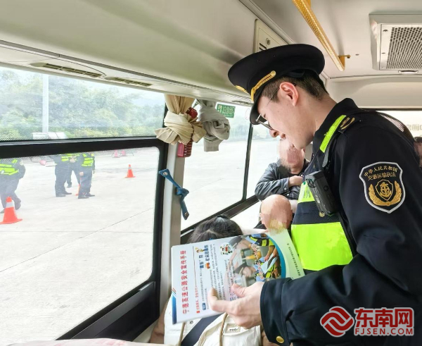 執(zhí)法員在客車上發(fā)放宣傳手冊