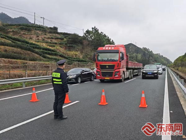執(zhí)法人員協(xié)助交警進行交通管制。寧德高速執(zhí)法支隊供圖 事故車輛側(cè)翻橫亙于車道之間,車體嚴重變形,路面出現(xiàn)燃油滲漏。執(zhí)法人員迅速聯(lián)合交警、養(yǎng)護等部門對事故區(qū)域?qū)嵤┡R時交通管制,在隧道入口及沿線通過可變情報板發(fā)布警示信息,引導(dǎo)后方車輛減速避讓,并對滯留司乘人員耐心開展現(xiàn)場解說,說明事故情況及安全注意事項,緩解群眾焦慮情緒。同時,執(zhí)法人員協(xié)助救援力量對被困人員展開施救,利用反光錐筒、警示燈等設(shè)備對現(xiàn)場進行安全布控,防止次生事故發(fā)生。救援過程中,執(zhí)法人員同步對事故造成的路產(chǎn)損失進行詳細勘驗,固定現(xiàn)場證據(jù),為后續(xù)處置提供依據(jù)。