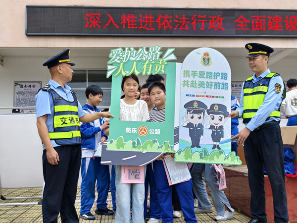 學生們在愛路護路拍照墻上有序進行打卡拍照。 進?!按蚩ā?,埋下愛路護路種子 5月12日上午,將樂公路安全路產(chǎn)人員聯(lián)合縣交通運輸綜合執(zhí)法大隊到大源中心學校開展路政宣傳活動?!耙欢瑦勐纷o路,人人有責,茄子”,將樂路政宣傳通過充滿童趣的拍照打卡以及愛路護路,人人有責簽名欄等形式,一下激起了同學們參與的積極性。同時還通過視頻課件,用通俗易懂的語言、發(fā)散性問題介紹公路的特點,講解公路安全小知識。講解結(jié)束后還分發(fā)宣傳手冊并設置有獎競答環(huán)節(jié),以鞏固此次學習成果,通過本次行動,小朋友們對路產(chǎn)路權(quán)有了更深刻的理解,順利在孩子心中種下愛路護路的“法治種子”。