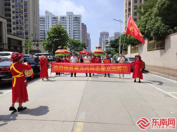 送喜報(bào) 東南網(wǎng)5月16日訊(通訊員 胡彰彬 文/圖)為進(jìn)一步弘揚(yáng)擁軍優(yōu)屬優(yōu)良傳統(tǒng),增強(qiáng)軍人軍屬榮譽(yù)感,5月15日上午,莆田市秀嶼區(qū)退役軍人事務(wù)局聯(lián)合笏石街道工作人員,一同前往笏石街道吳黃村為榮立“三等功”的黃萬興家屬送來喜報(bào)和慰問金。 “咚鏘咚鏘咚咚鏘、咚咚鏘……”伴隨著一陣陣歡快而熱烈的鑼鼓聲,一條橫幅高高掛起,“熱烈祝賀黃萬興同志榮立三等功”字樣格外耀眼。送喜報(bào)隊(duì)伍一路敲鑼打鼓來到立功人員家中,為黃萬興父母佩戴“一人立功,全家光榮”綬帶和大紅花,將立功喜報(bào)、慰問金送到黃萬興父母手中,向他們表示衷心的祝賀,并送上黨和政府的深切關(guān)懷。 立功受獎(jiǎng)的背后凝結(jié)著軍人矢志強(qiáng)軍的心血和汗水,承載著軍人使命高于生命的責(zé)任與榮譽(yù)。而深入開展送喜報(bào)活動(dòng),既是對(duì)軍人榮譽(yù)的尊崇,更讓軍人家屬感受到社會(huì)的關(guān)愛與尊重,進(jìn)一步營造“一人立功,全家光榮”的濃厚社會(huì)氛圍,讓尊崇秀嶼更加尊崇,讓“光榮之家”更加光榮。 |