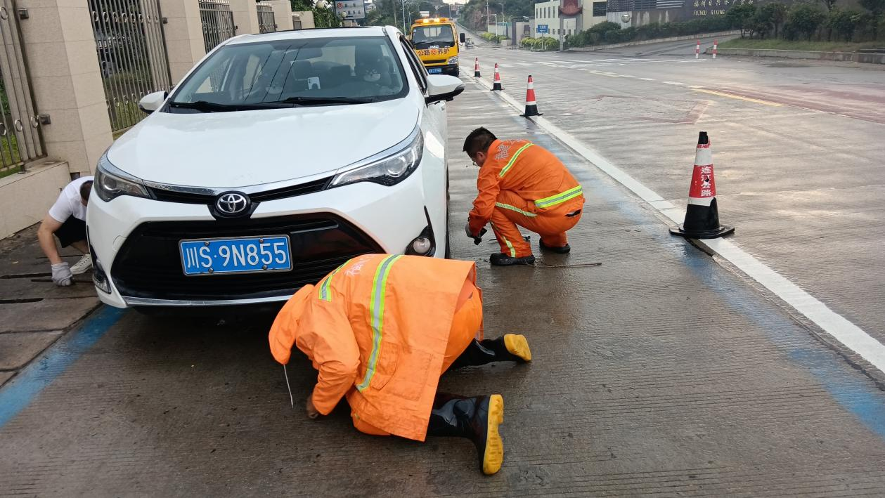 東南網(wǎng)連江7月11日訊(通訊員 劉江華)“您好!我的車出故障了,車底下一直響,可底盤太低,實在看不清到底怎么回事,你們能幫忙看看嗎?”7月8日下午4點半左右,連江公路中心筱埕公路服務(wù)站的門被匆匆推開,一位滿臉焦灼的司機前來求助,額頭上還掛著臺風天里被風吹來的雨珠。 “別急,我們?nèi)タ纯?!”正在站?nèi)清點應急物資、調(diào)試機械設(shè)備的陳平和謝忠,一聽這話立刻放下手里的活計,快步跟著司機來到車旁,蹲下身仔細檢查。 原來,臺風帶來的短時強降雨讓路面積起水洼,司機車速稍快,積水瞬間形成的沖擊力把發(fā)動機下護板撞得斷裂變形,死死卡著底盤,車子根本動不了。