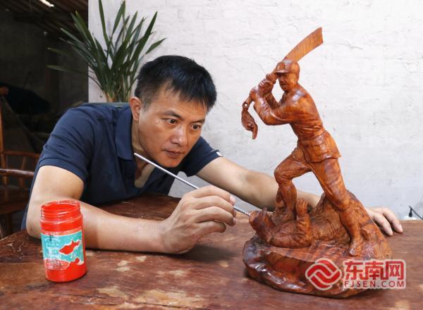 陳金瑞木雕創(chuàng)作 東南網(wǎng)8月14日訊(通訊員 陳文華 文/圖)8月13日,在興化府歷史文化街區(qū)非遺一條街傳承非遺雕塑工作室,福建省工藝美術(shù)名人、莆田工藝美術(shù)大師陳金瑞以刀為筆、以木作紙,經(jīng)過(guò)長(zhǎng)達(dá)6個(gè)月的精心雕琢,創(chuàng)作完成“抗戰(zhàn)木雕”作品《大刀向鬼子們的頭上砍去》《走向勝利》,以此深情紀(jì)念中國(guó)人民抗日戰(zhàn)爭(zhēng)暨世界反法西斯戰(zhàn)爭(zhēng)勝利80周年。 據(jù)悉,莆田木雕是中國(guó)木雕四大名雕之一,2011年5月被列入國(guó)家級(jí)非物質(zhì)文化遺產(chǎn)名錄?!坝闷翁锬镜襁@種永恒的藝術(shù)形式來(lái)記載抗戰(zhàn)故事,讓大家在欣賞藝術(shù)作品中銘記歷史,緬懷先烈,感受家國(guó)情懷,珍惜來(lái)之不易的和平生活?!标惤鹑鸾榻B,此次兩件“抗戰(zhàn)木雕”作品,充分運(yùn)用莆田木雕精湛細(xì)膩的傳統(tǒng)技藝融合現(xiàn)代雕塑等元素,用傳承的刻刀訴說(shuō)著中華民族無(wú)數(shù)優(yōu)秀兒女,在中國(guó)共產(chǎn)黨的領(lǐng)導(dǎo)下,舍生忘死、英勇無(wú)畏、可歌可泣的抗戰(zhàn)故事。 在選材上,兩件“抗戰(zhàn)木雕”作品選用上等涯柏木和臺(tái)灣檜木,細(xì)節(jié)刻畫(huà)入微,氣勢(shì)雄渾磅礴。其中,作品《大刀向鬼子們的頭上砍去》以極具張力的構(gòu)圖和凌厲的刀法,定格了抗日將士揮舞大刀奮勇劈殺敵人的震撼瞬間,令人血脈僨張;而作品《走向勝利》則通過(guò)軍人揮舞飄揚(yáng)軍旗、目光堅(jiān)毅、腳步堅(jiān)定前行的塑造,生動(dòng)展現(xiàn)了中華民族不屈不撓、勇往直前的精神風(fēng)貌。 陳金瑞創(chuàng)作這些作品,還源于深厚的個(gè)人情感。他透露:“父親是一名退役軍人,我從小就崇拜軍人,他們身上那種不怕?tīng)奚⒂⒂骂B強(qiáng)、保家衛(wèi)國(guó)的鋼鐵意志一直激勵(lì)著我在從藝道路上不斷前行?!?/p> 下一步,陳金瑞還計(jì)劃以“軍魂”為主題開(kāi)展系列創(chuàng)作,在中國(guó)人民解放軍建軍100周年之際,舉辦《海空衛(wèi)士王偉雕像》《寸土不讓》等紅色木雕專(zhuān)題展,用藝術(shù)作品傳播社會(huì)正能量,營(yíng)造尊崇軍人、尊重退役軍人良好風(fēng)尚。 |