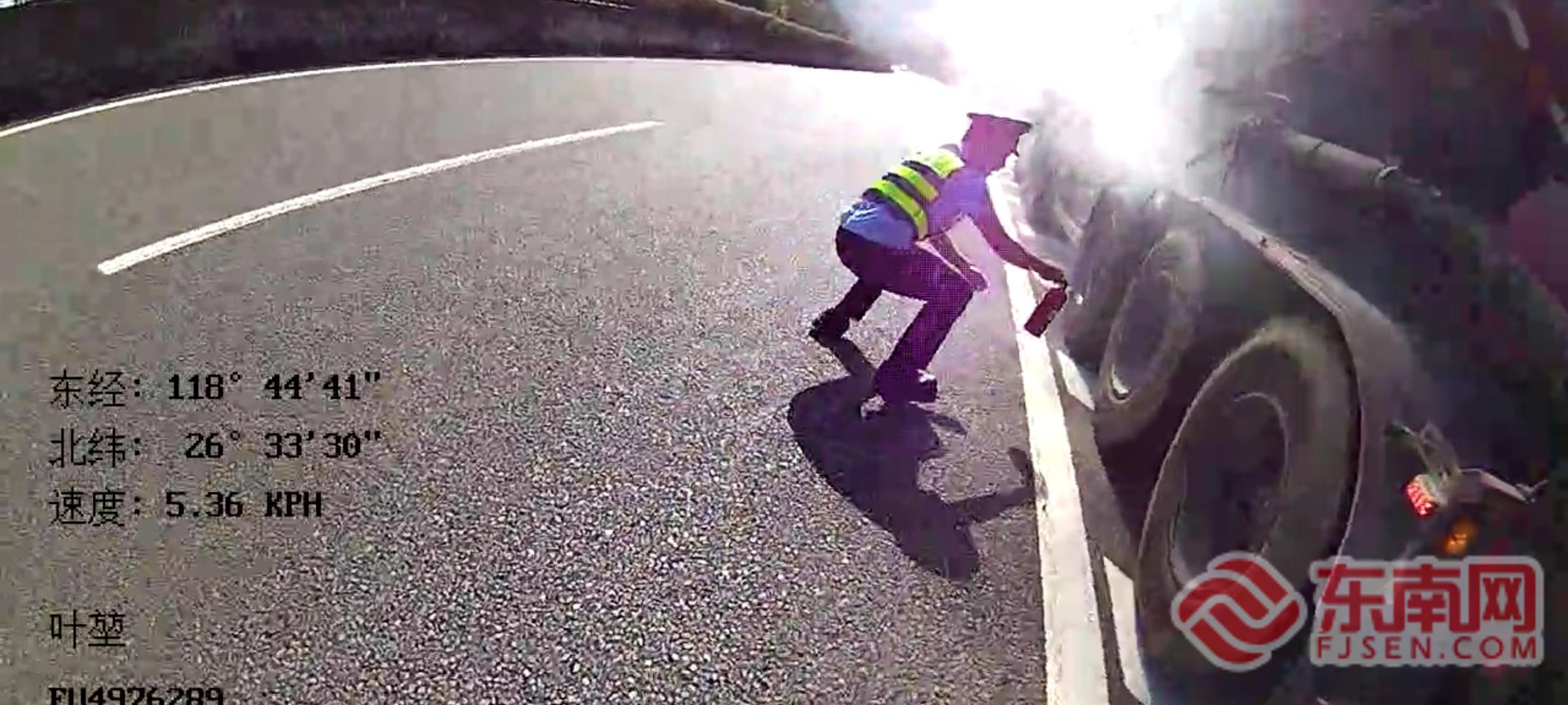 執(zhí)法記錄儀中執(zhí)法員滅火身影 同時(shí),寧德高速執(zhí)法支隊(duì)依托“5+N”聯(lián)動(dòng)機(jī)制,第一時(shí)間協(xié)調(diào)高速交警、路勤等部門到場(chǎng),共同完成現(xiàn)場(chǎng)后續(xù)處置。經(jīng)調(diào)查,此次火情起因是貨車司機(jī)長(zhǎng)時(shí)間行駛途經(jīng)長(zhǎng)下坡路段,車輛剎車系統(tǒng)故障引發(fā)輪胎抱死起火。 此次處置從發(fā)現(xiàn)火情到控制火勢(shì),全程高效有序,充分展現(xiàn)了寧德高速執(zhí)法隊(duì)伍“素質(zhì)過(guò)硬、作風(fēng)優(yōu)良”的鐵軍風(fēng)貌。在危急時(shí)刻展現(xiàn)了寧德高速執(zhí)法人的擔(dān)當(dāng),切實(shí)為“雙節(jié)”期間高速公路通行安全筑牢防線。 |