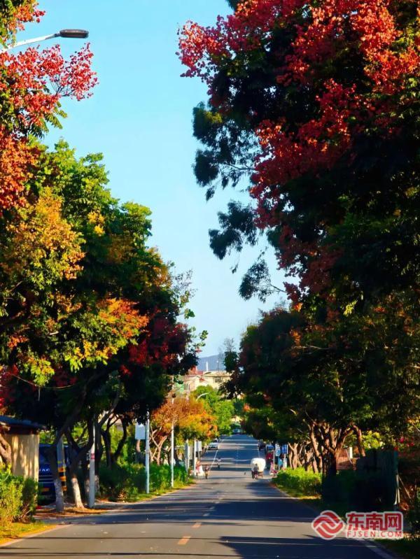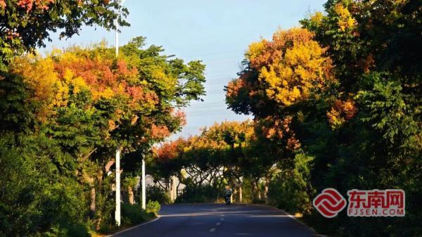 成排欒樹進入盛花期(廈門公路中心供圖) 東南網(wǎng)10月14日訊(本網(wǎng)記者 劉瑋 通訊員 林阿娜)“欒樹花開秋意濃,一年能占十月春”。近日,廈門市翔安區(qū)內(nèi)厝鎮(zhèn)上塘村路段與黃山路縣道411線交叉處,長達6公里的成排欒樹進入盛花期。從附近高樓俯瞰,整條道路宛如“黃金大道”,秋意十足的景致吸引眾多市民游客前來打卡拍照。 據(jù)悉,欒樹又名“燈籠樹”,屬無患子科欒樹屬高大落葉喬木。成年欒樹可長至十幾米甚至二十多米,樹干筆直,灰褐色樹皮粗糙厚實,縱向裂紋盡顯歲月痕跡。欒樹獨特之處在于花期與果期銜接自然,暮夏初秋之際,細碎金黃花簇先綴滿枝頭,花期可持續(xù)至10月中旬;花謝后,形似燈籠的紅褐色蒴果便掛滿枝干。當(dāng)前時節(jié),道路兩側(cè)的欒樹呈現(xiàn)出金黃、淡綠、深褐交織的景致——枝頭黃花未謝,紅果已掛,與綠葉相映成趣,構(gòu)成天然“三色畫卷”。微風(fēng)吹過,黃花飄落,在馬路與人行道上鋪就“別樣花?!?,讓觀賞者暫忘城市喧囂,感受自然寧靜。