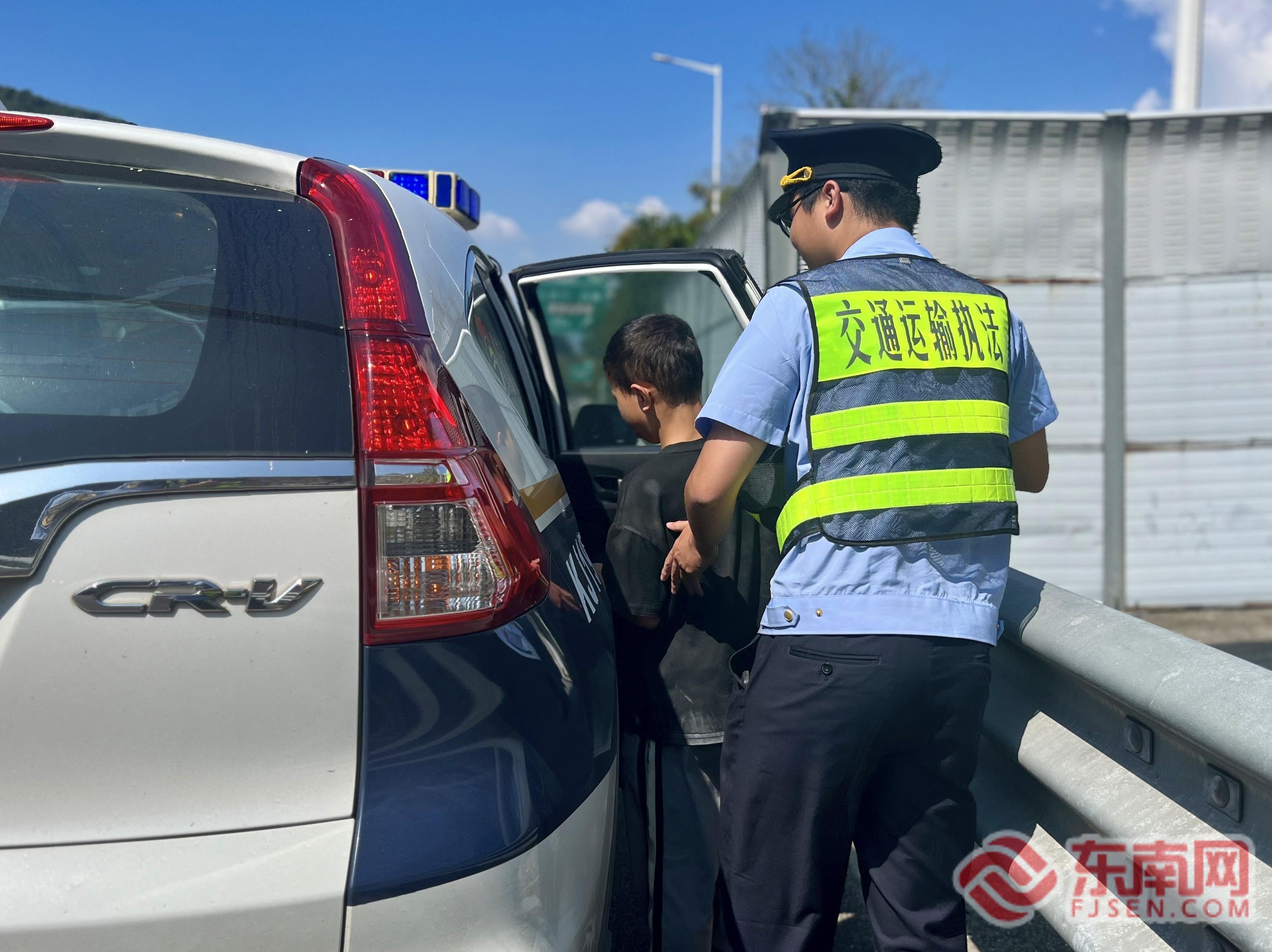 勸離高邊坡玩耍少年。寧德高速公路行政執(zhí)法支隊供圖 執(zhí)法人員立即靠邊停車,迅速做好現(xiàn)場安全布控,隨后上前將少年引導(dǎo)至護欄外的安全區(qū)域。經(jīng)耐心安撫與詢問,得知該少年是附近白巖村的村民,因天氣炎熱,在隧道口臺階處休息,并未意識到自己已身處險境。