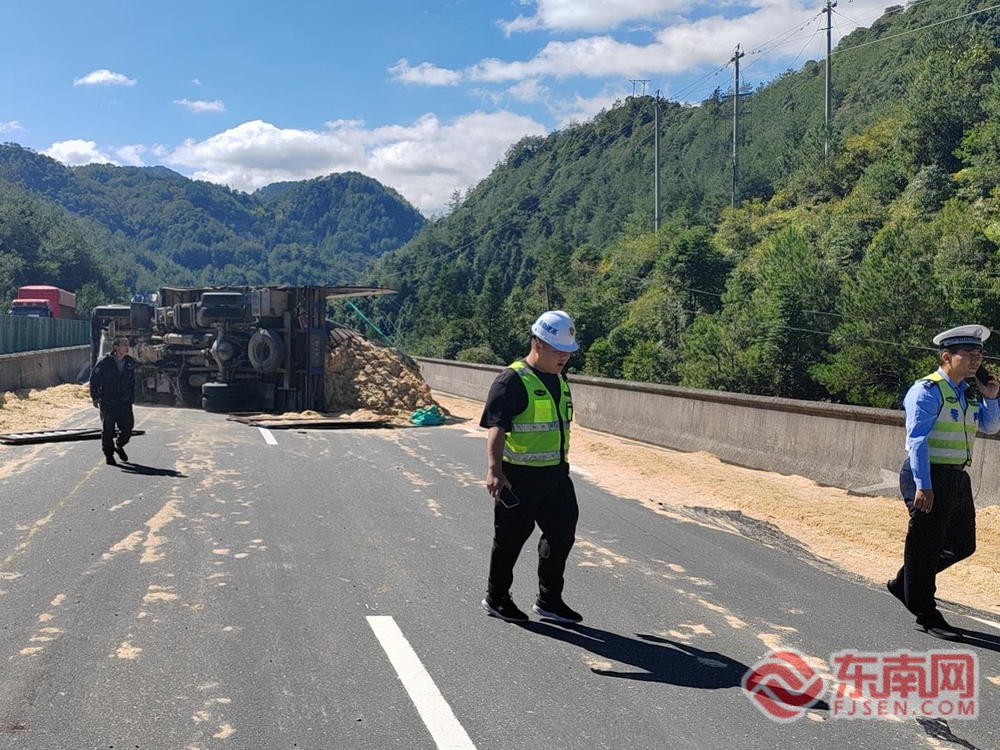 東南網(wǎng)10月24日訊(通訊員 李思澄 劉曉涌)10月23日中午,寧上高速發(fā)生一起貨車側(cè)翻事故,所載鋸粉大量?jī)A灑,導(dǎo)致主干道通行受阻。寧德高速執(zhí)法支隊(duì)周寧中隊(duì)接警后火速出動(dòng),聯(lián)合相關(guān)部門經(jīng)過緊張?zhí)幹?,于?dāng)日15時(shí)40分成功排除險(xiǎn)情,恢復(fù)道路正常通行。 23日12時(shí)09分,寧德高速執(zhí)法支隊(duì)周寧中隊(duì)接到報(bào)警稱:在寧上高速A83K+900處,一輛貨車發(fā)生側(cè)翻,貨物灑落主干道。中隊(duì)執(zhí)法人員聞?dòng)嵙⒓幢几艾F(xiàn)場(chǎng),經(jīng)現(xiàn)場(chǎng)確認(rèn),側(cè)翻貨車運(yùn)載的為鋸粉,因包裝破損大面積灑落,形成安全隱患,嚴(yán)重影響交通安全。