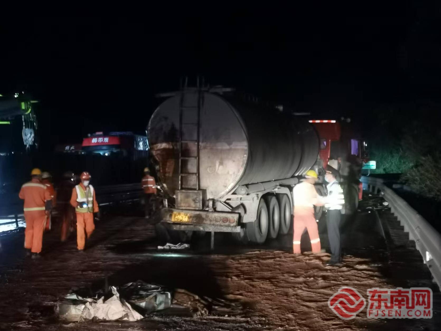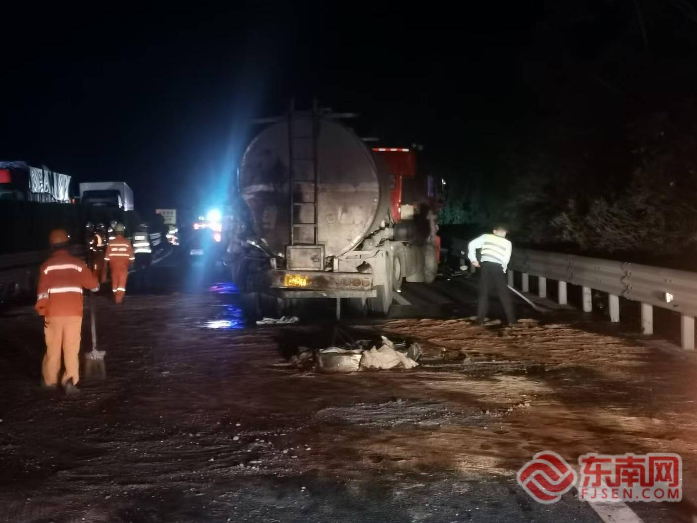 現(xiàn)場(chǎng)處置。寧德高速執(zhí)法支隊(duì)供圖 當(dāng)晚21時(shí)許,在沈海高速B道1943KM+140M處,一輛半掛貨車與一輛油罐車發(fā)生追尾,導(dǎo)致油罐車罐體破損,車內(nèi)廢油發(fā)生泄漏,B道路面受到嚴(yán)重污染。泄漏的油污甚至蔓延至對(duì)向A道,致使該側(cè)先后有七輛汽車因路面濕滑發(fā)生碰撞,事故影響進(jìn)一步擴(kuò)大。