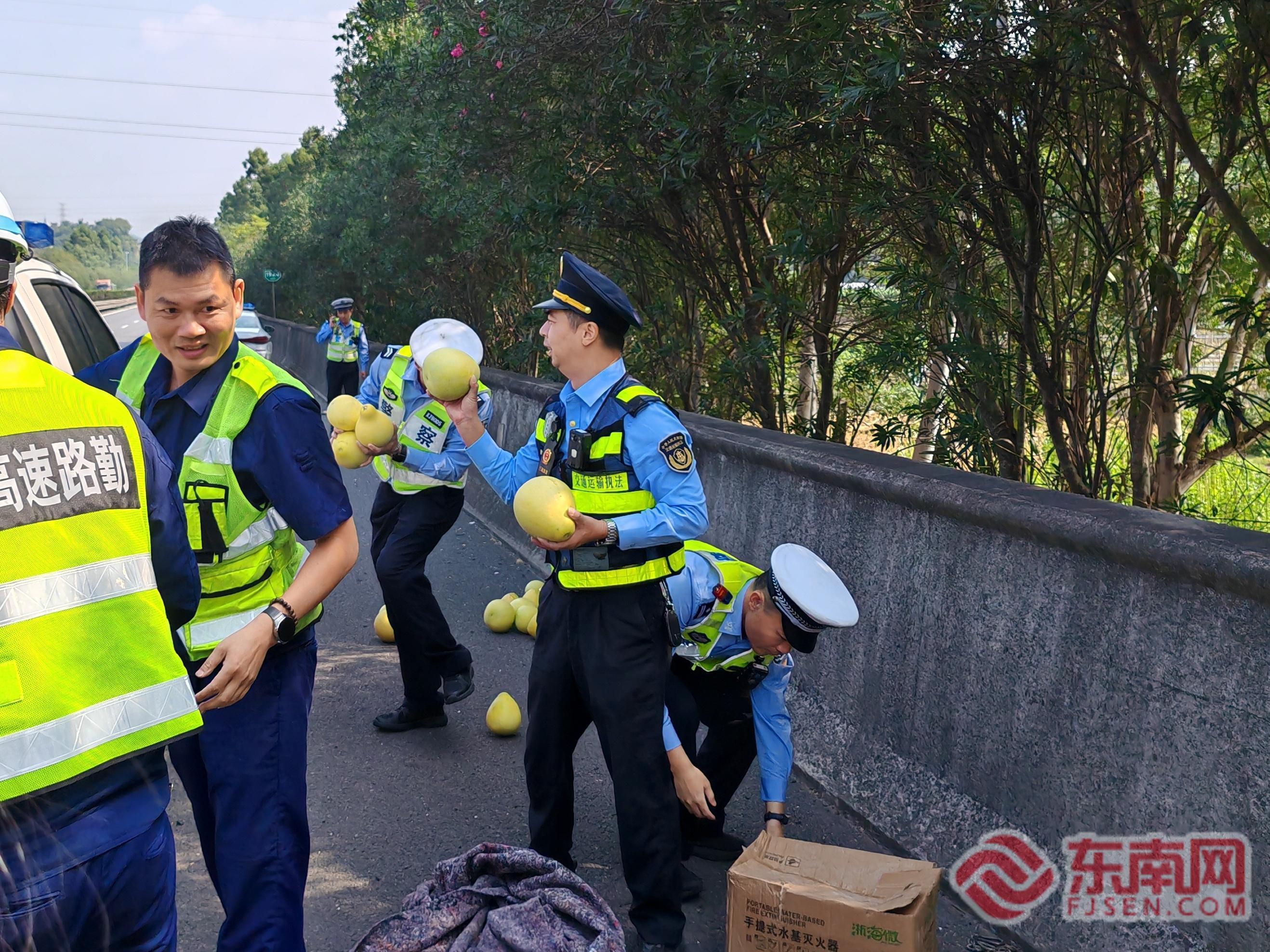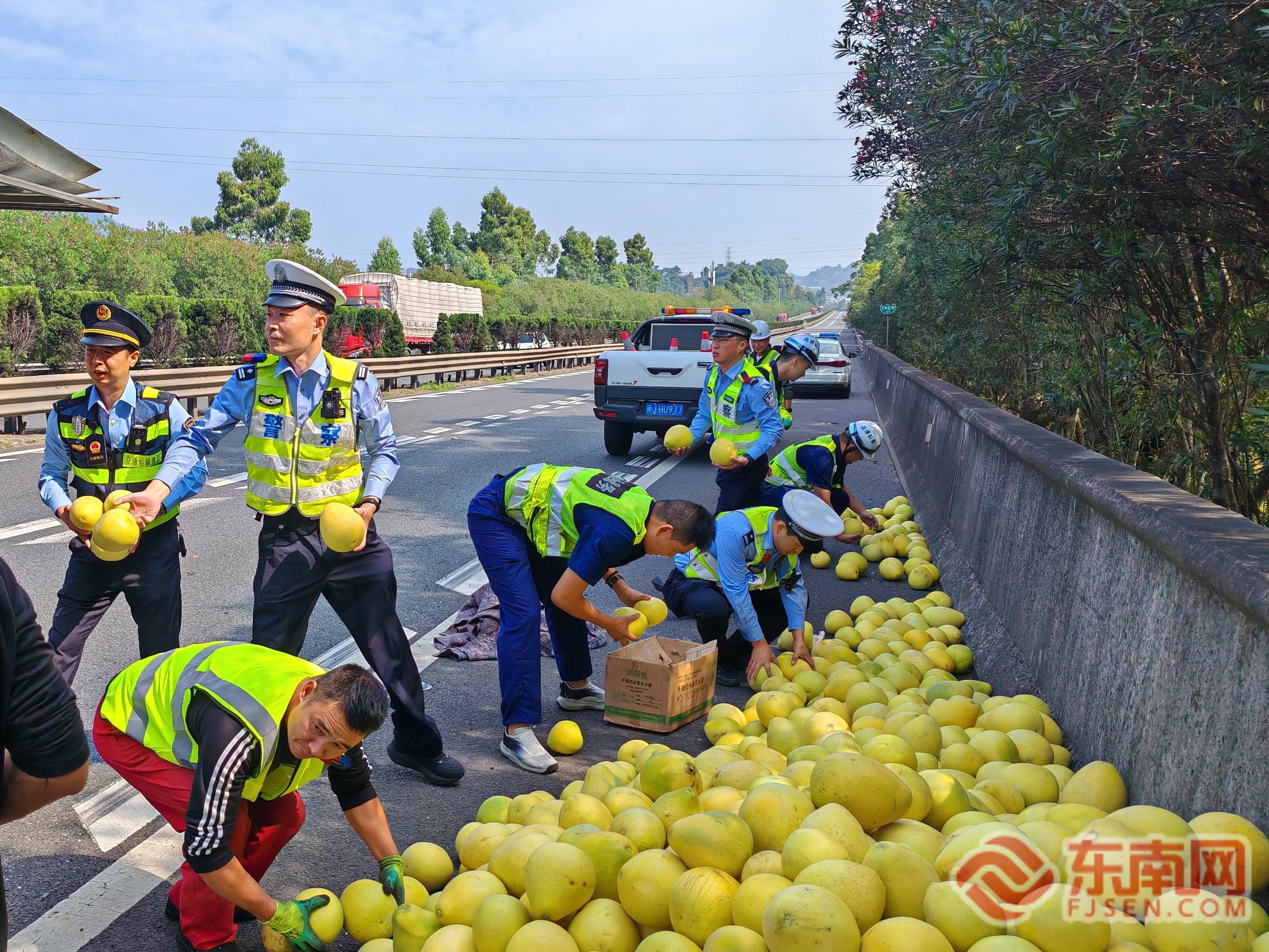 合力處置灑落柚子。寧德高速執(zhí)法支隊供圖 情況緊急,刻不容緩。執(zhí)法人員立即啟動應(yīng)急預(yù)案,同步激活“5+N”協(xié)作機制?,F(xiàn)場各方力量分工明確、協(xié)同高效:一組人員迅速負(fù)責(zé)現(xiàn)場安全布控,在事故后方規(guī)范設(shè)置警示區(qū)域,擺放反光錐筒,并指揮引導(dǎo)后方車輛有序通行;另一組人員則與聞訊趕來的高速交警、路勤、養(yǎng)護等聯(lián)動單位并肩協(xié)作,以應(yīng)急車道為主作業(yè)面,全力投入散落柚子的清理與轉(zhuǎn)運工作。整個處置流程銜接緊密,各方配合默契,形成了高效的處置合力。