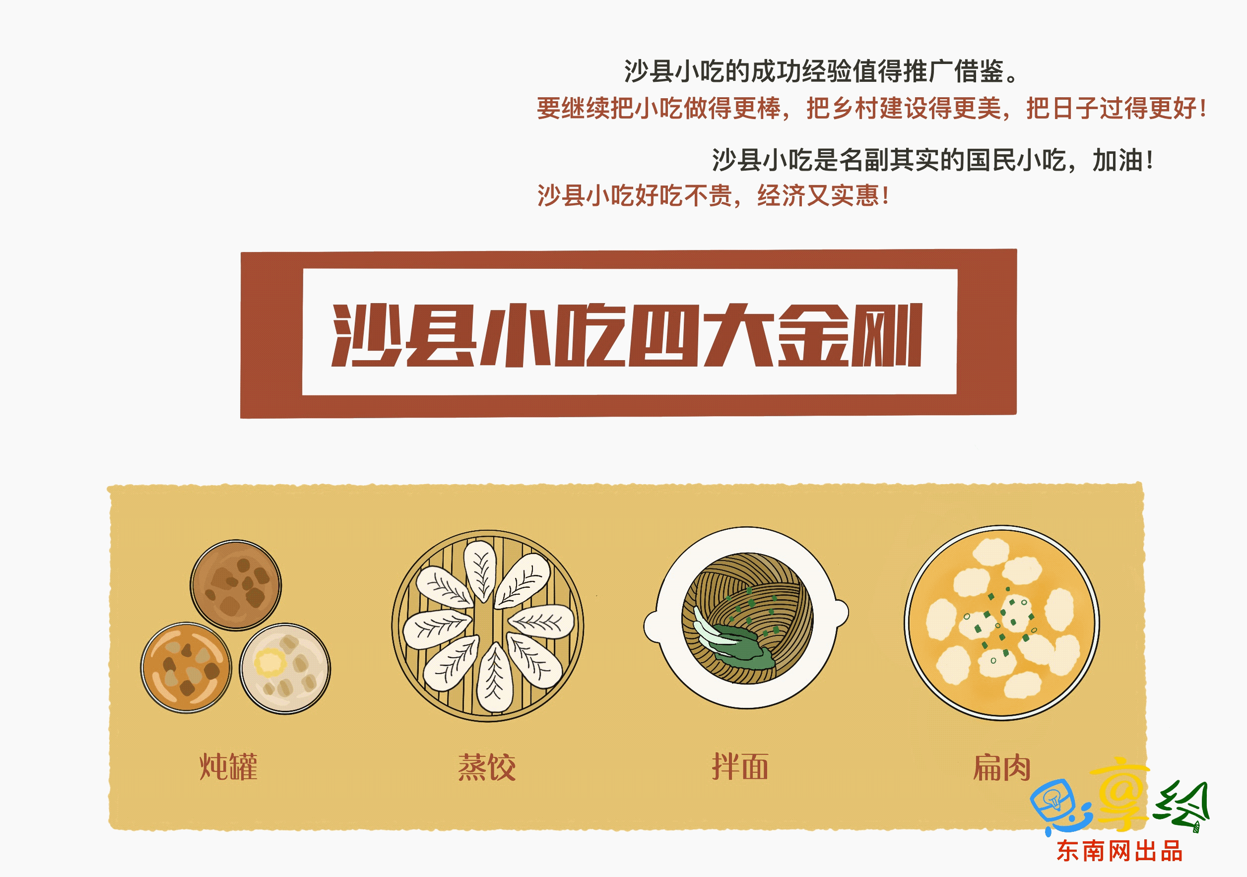 2021-03-31 21:44:38 來(lái)源:東南網(wǎng) 責(zé)任編輯:孫勁貞 作者:孔德淇新聞背景:3月23日下午,習(xí)近平總書記來(lái)到三明市沙縣區(qū)夏茂鎮(zhèn)俞邦村。習(xí)近平指出,沙縣人走南闖北,把沙縣小吃打造成了富民特色產(chǎn)業(yè)。鄉(xiāng)村要振興,因地制宜選擇富民產(chǎn)業(yè)是關(guān)鍵。要抓住機(jī)遇、開(kāi)闊眼界,適應(yīng)市場(chǎng)需求,繼續(xù)探索創(chuàng)新,在創(chuàng)造美好生活新征程上再領(lǐng)風(fēng)騷。 漫畫:孫青春 短評(píng):沙縣小吃,大有作為,其成功之處正在于立足本地、準(zhǔn)確定位、發(fā)展特色。鄉(xiāng)村要振興,也要像做大“沙縣小吃”一樣,因地制宜選擇特色產(chǎn)業(yè),闖出致富路子。就在習(xí)近平總書記來(lái)到沙縣的前一天,《中共中央國(guó)務(wù)院關(guān)于實(shí)現(xiàn)鞏固拓展脫貧攻堅(jiān)成果同鄉(xiāng)村振興有效銜接的意見(jiàn)》全文公布。意見(jiàn)把“支持脫貧地區(qū)鄉(xiāng)村特色產(chǎn)業(yè)發(fā)展壯大”擺在突出位置加以強(qiáng)調(diào)。在鄉(xiāng)村振興的壯美畫卷上,我們固然需要勤勤懇懇、埋頭趕路,但也要開(kāi)闊眼界、抬頭看路,積極適應(yīng)市場(chǎng)需求,探索挖掘更多的“沙縣小吃”,以地方特色破解“三農(nóng)”問(wèn)題,用小美食寫好大文章,為鄉(xiāng)村振興打造更高水平樣板,在創(chuàng)造美好生活新征程上引領(lǐng)風(fēng)騷。 農(nóng)副產(chǎn)品深受外地人民熱捧,逐漸“走出去”,也側(cè)面反映出依托地理優(yōu)勢(shì)、文化鄉(xiāng)愁,昔日的鄉(xiāng)村美食也能作為抓手,變身鄉(xiāng)村振興的“孵化器”。但也該看到,美食既是飲食,也是人文和歷史;食物不僅能“果腹”,還蘊(yùn)含世間百態(tài)、故事文化。大江南北、山河湖海,美食和口味應(yīng)有盡有,在茫?!凹t?!崩?,“沙縣小吃”要不斷創(chuàng)新、走得更遠(yuǎn),還要深耕IP背后的中國(guó)傳統(tǒng)、文化與人情,在“吃”背后的人與事上面做文章——經(jīng)由小吃這個(gè)窗口,讓人看到妙趣橫生的市井氣,了解人和食物的關(guān)系、人和鄉(xiāng)土的關(guān)系。(孔德淇) |