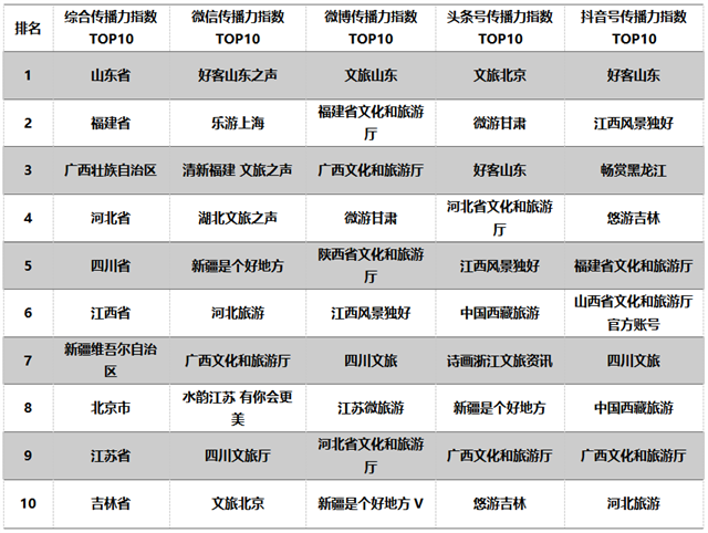 近日,文旅產(chǎn)業(yè)指數(shù)實(shí)驗(yàn)室發(fā)布2022年度全國(guó)省級(jí)文旅新媒體傳播力指數(shù)報(bào)告,2022年度綜合傳播力指數(shù)前十的有:山東省、福建省、廣西壯族自治區(qū)、河北省、四川省、江西省、新疆維吾爾自治區(qū)、北京市、江蘇省、吉林省。其中,福建省位居第二位。