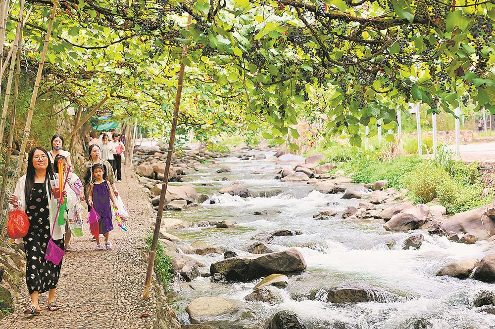 游客暢享親水之樂。 游客在溪水邊的刺葡萄藤下漫步。 東南網(wǎng)8月29日訊(福建日報報記者 單志強 通訊員 李郁 陳雅芳 攝影報道)藤上葡萄滿架,藤下溪水潺潺。初秋,位于福安市穆云畬族鄉(xiāng)溪塔村的“中國最美葡萄溝”內(nèi),綿延6公里的刺葡萄進入采摘季。作為福安本地“土著”品種葡萄,刺葡萄于上世紀六七十年代在溪塔村的秀溪兩岸溝澗中被大面積種植。目前,該村刺葡萄種植面積已達1200多畝,形成了年產(chǎn)值約1200萬元的地域特色果業(yè)。 每至初秋刺葡萄豐收,溪塔村都會吸引許多游客前來采摘,這里自然風光和畬鄉(xiāng)文化的美名也不脛而走。近年來,穆云畬族鄉(xiāng)加大旅游基礎配套設施投入,建設下坪魚鱗壩、沿溪夜景燈光、畬家酒坊、畬族文化館等,進一步吸引游客前來體驗畬鄉(xiāng)慢生活,刺葡萄等特色農(nóng)產(chǎn)品的銷路也更加通暢。 |