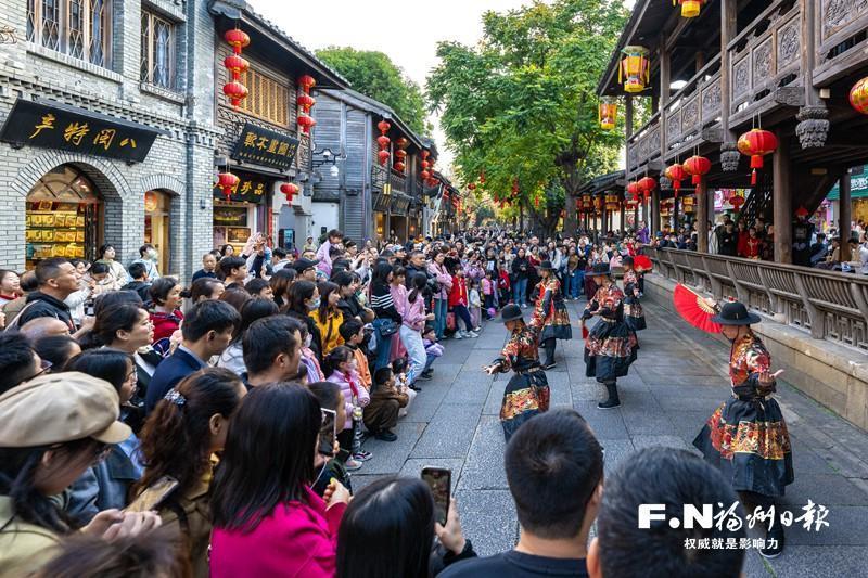 三坊七巷內(nèi)的沉浸式表演吸引許多游客駐足觀看。記者 林雙偉 攝 以文塑旅 旅途煥彩 金秋十月,第五屆煙臺山文化藝術季將整個煙臺山街區(qū)打造成開放式美術館,戶外裝置藝術與百年老建筑相得益彰?!八囆g已經(jīng)完全融入了街區(qū)的肌理!”來自上海的攝影師張先生一邊捕捉光影,一邊贊嘆道。國慶中秋假期里,煙臺山客流量達92.2萬人次,日均客流量超10萬人次,成為展現(xiàn)福州文藝氣質(zhì)的重要窗口。 “十四五”以來,福州通過場景、文化與體驗的緊密結(jié)合,讓旅游不斷煥發(fā)出新的活力。從節(jié)慶旅游到非遺手作體驗,再到“為展赴城”(指因特定展覽活動而專程前往某城市)的新風尚,富含文化底蘊的旅游新業(yè)態(tài)持續(xù)“出圈”,精準契合游客需求。 傳統(tǒng)非遺的創(chuàng)新演繹,更讓旅途有了深層文化共鳴。在福州評話伬藝傳習所劇場,互動式閩劇《三山舊夢》讓年輕游客曾凡眼前一亮:“沒想到閩劇能這么時尚!”該劇音樂總監(jiān)陳強帶領團隊保留《茉莉花》《嘆四季》等傳統(tǒng)曲牌原有韻律,融入現(xiàn)代編曲手法,讓老戲迷能品出傳統(tǒng)韻味、新觀眾也覺悅耳動人。