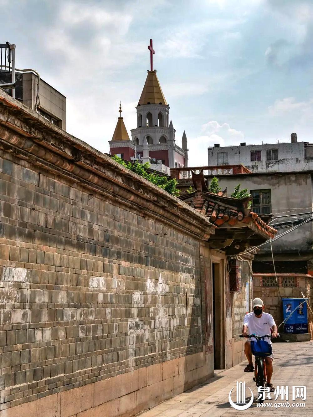 古榕巷嵌入墻面的觀音像 古榕巷“奇妙”之處:消失的古榕樹、嵌在墻上的觀音像、古城最小的石敢當(dāng)。60號院內(nèi)有世遺點(diǎn)南外宗正司遺址;36號龔宅自發(fā)保護(hù)附近被遺棄的觀音雕像,將其嵌入墻面;22號有古城最小石敢當(dāng),造型生動(dòng)有趣。這些都是古城人家可愛的小細(xì)節(jié)。 舊館驛巷算是一條低調(diào)的寶藏小巷,藏著眾多文物史跡。2號的董楊大宗祠是全國僅有的董、楊聯(lián)宗史跡;4號是泉州最后一位登科狀元吳魯?shù)淖x書處,鄰居有一副意味深長的書法對聯(lián):人生得一知己足矣,斯世當(dāng)以同懷視之。巷內(nèi)還有楊濱海進(jìn)士第、王海文故居等等。 鬧中取靜感受煙火氣 線路:金魚巷—花巷—許厝埕 金魚巷:271米長的金魚巷有不少值得停留的風(fēng)景:建筑、展覽、古早味、咖啡館,新舊業(yè)態(tài)在這里共融。安靜有序,有咖啡香、煙火氣,也有旺盛的人氣。沒人能拒絕這條鬧中取靜的寶藏小巷。 花巷:泉州最“浪漫”的巷子,以花之名,美得剛剛好。傅宅曾是花巷最高建筑,修繕后也常辦些展覽。門楣上“版筑傳芳”的傅氏堂號傾訴著來處。游客來到泉州,流連于小巷時(shí),可認(rèn)真找找每家每戶特有的郡望堂號。 許厝埕:工藝美術(shù)廠經(jīng)常舉辦各類文旅活動(dòng),粉紅天主教堂也在旁邊。教堂對面,還有一處極富傳統(tǒng)文化內(nèi)涵的敬字亭可以看看。 來看看“踮腳”怕淹的房子 線路:奎霞巷—承天巷—敷仁巷 奎霞巷:在這里你可以看到踮著腳的房子。泉州古城水系發(fā)達(dá),曾經(jīng)一條舢板船就可以順著城內(nèi)水路,抵達(dá)各條街巷。街巷與水相鄰,“踮腳”怕淹的房子,就這么來的。