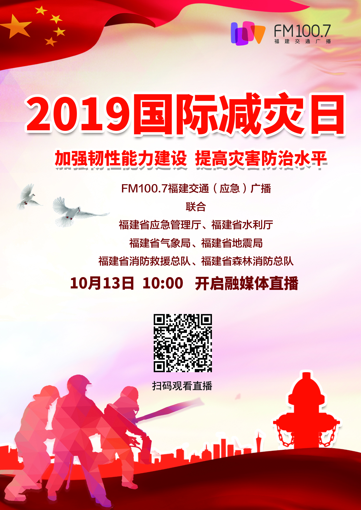 10月13日是第30個(gè)國(guó)際減災(zāi)日,1007福建交通(應(yīng)急)廣播特別聯(lián)合福建省應(yīng)急管理廳、福建省水利廳、福建省氣象局、福建省地震局、福建省消防救援總隊(duì)、以及福建省森林消防總隊(duì)開(kāi)啟融媒體特別直播,為您權(quán)威、全面、立體呈現(xiàn)福建省防災(zāi)減災(zāi)救災(zāi)工作情況,科普防災(zāi)減災(zāi)救災(zāi)知識(shí)。加強(qiáng)韌性能力建設(shè),提高災(zāi)害防治水平。歡迎鎖定1007收聽(tīng),您也可以發(fā)送關(guān)鍵詞“減災(zāi)”到1007微信公眾平臺(tái)實(shí)時(shí)收看直播啦。 ![]() |