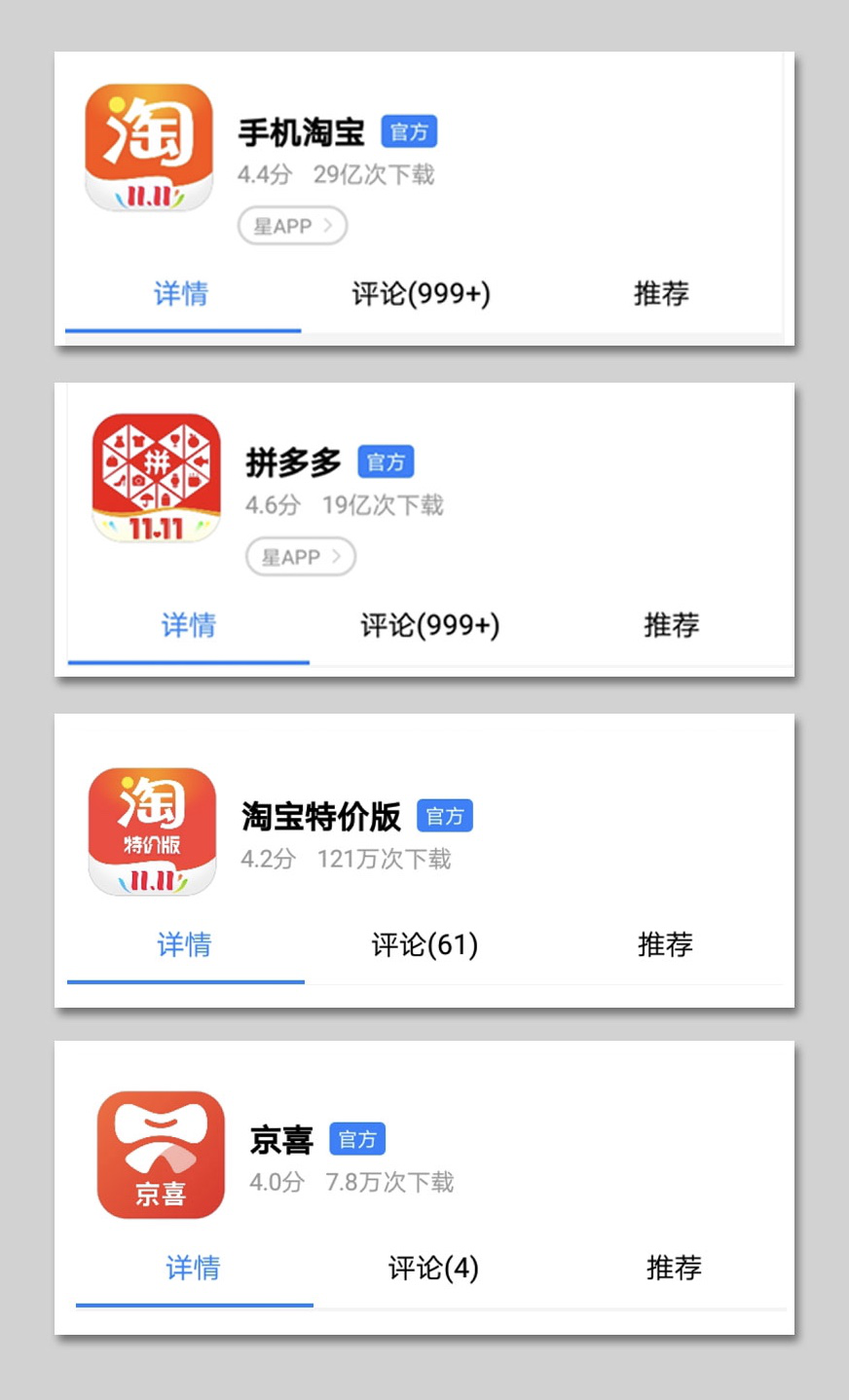 ▲2019年9月,拼多多、手機淘寶、Wish位列全球APP Store購物類應(yīng)用榜前三。在全球購物類應(yīng)用總榜單(APP Store+Google Play)上,由于未統(tǒng)計包括騰訊應(yīng)用寶、華為應(yīng)用商城等在內(nèi)的第三方平臺數(shù)據(jù),拼多多、手機淘寶的9月下載量分列全球第6和第8。 Sensor Tower此前發(fā)布的數(shù)據(jù)顯示,今年二季度,拼多多成為全球蘋果用戶下載量最大的中國應(yīng)用。三季度,拼多多繼續(xù)維持強勁增長,在APP Store中國大陸地區(qū)的全應(yīng)用榜單上,拼多多與字節(jié)跳動旗下的剪輯工具“剪映”,是唯二在當月30個自然日中均進入總榜前十的應(yīng)用。 自2018年下半年以來,中國大陸地區(qū)APP Store下載榜競爭激烈,榜單前十應(yīng)用高頻率更替,拼多多是為數(shù)不多始終保持下載量領(lǐng)先的應(yīng)用。 安卓市場方面,Sensor Tower的數(shù)據(jù)顯示,Club Factory、Wish、亞馬遜分列全球下載榜前三。該項數(shù)據(jù)僅統(tǒng)計了Google Play商店的官方數(shù)據(jù),未統(tǒng)計包括騰訊應(yīng)用寶、華為應(yīng)用商城、小米應(yīng)用商店等在內(nèi)的主流第三方Android下載平臺,此類第三方平臺是Android應(yīng)用最大的下載源。 受該統(tǒng)計口徑影響,在全球購物類應(yīng)用總榜單(APP Store+Google Play)上,拼多多、手機淘寶的9月下載量分列全球第6和第8。 在中國各大第三方安卓商城中,購物類應(yīng)用下載量維持高速增長。騰訊應(yīng)用寶的數(shù)據(jù)顯示,截至目前,手機淘寶的總下載量已達29億次,上線僅4年的拼多多,下載量急速攀升至19億次。阿里巴巴和京東針對下沉市場推出的“淘寶特價版”和“京喜”,下載量分別為121萬次和7.8萬次。