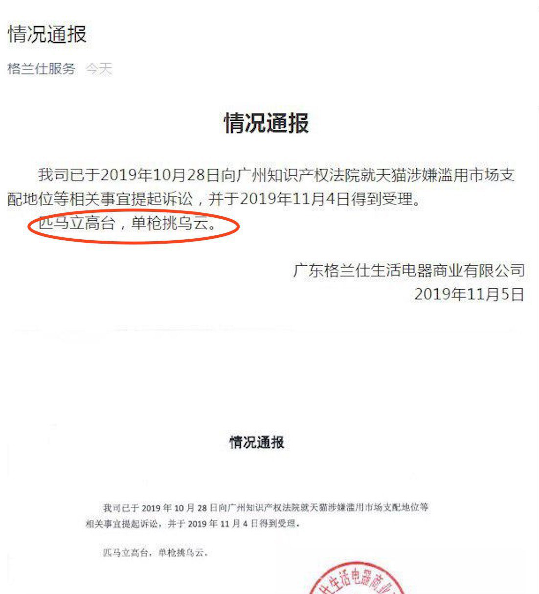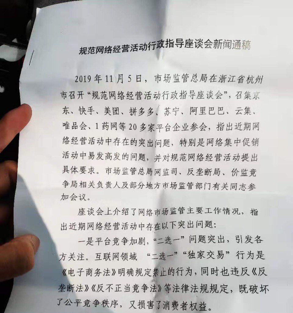 ▲“匹馬立高臺,單槍挑烏云”,格蘭仕發(fā)布情況通報顯示,訴天貓“涉嫌濫用市場支配地位”一案已于11月4日得到受理。 情況聲明中,格蘭仕罕見地以“匹馬立高臺,單槍挑烏云”兩句詩表達態(tài)度。此前,格蘭仕曾4天連發(fā)8篇聲明,完整揭露了一家知名品牌遭遇平臺“技術暴力封店”的全過程,被網(wǎng)友稱為“硬漢”。 相關視頻及截圖顯示,在拒絕關閉其他平臺店鋪后,格蘭仕在天貓平臺的6家專賣店突然遭遇技術性屏蔽,消費者無法在搜索中找到格蘭仕相關商品及店鋪,單店流量從正常的日均數(shù)萬訪客下降至數(shù)百甚至個位數(shù),有網(wǎng)友認為,“這幾乎是被強拆”。 拼多多聯(lián)合創(chuàng)始人達達接受媒體采訪時曾進一步透露“二選一”中的隱蔽細節(jié),“有平臺希望通過公關手段,將‘二選一’包裝成為一種互惠互利的短時約定,但背后實際隱藏著‘下架封店于無形’的強勁技術暴力手段”。 今年4月份以來,包括格蘭仕、三只松鼠、蘇泊爾、美的、九陽等國產(chǎn)知名品牌紛紛遭遇“二選一”,據(jù)達達透露,僅拼多多平臺上遭遇這一“二選一”的知名品牌商就超過1000家,受波及的中小商家更是數(shù)以萬計。 據(jù)《解放日報》報道,在二選一的壓力下,關店和裁員的陰影籠罩在中小企業(yè)之上,但由于電商平臺的“二選一”操作手段越來越隱蔽”,因此,多數(shù)企業(yè)只能選擇忍讓。 這并不是天貓第一次因為“二選一”而被訴至法庭。2015年,京東也曾以“天貓濫用市場支配地位逼迫商戶二選一”將天貓訴至法院。此前,阿里巴巴公關委員會主席王帥在回應這一案件時曾表示,“二選一是正常的市場行為”。 同日,國家市場監(jiān)管總局在浙江省杭州市召開“規(guī)范網(wǎng)絡經(jīng)營活動行政指導座談會”上指出,互聯(lián)網(wǎng)領域 “二選一”“獨家交易”行為是《電子商務法》明確規(guī)定禁止的行為,同時也涉嫌違反《反壟斷法》《反不正當競爭法》等法律法規(guī)規(guī)定,既破壞了公平競爭秩序,又損害了消費者權益。