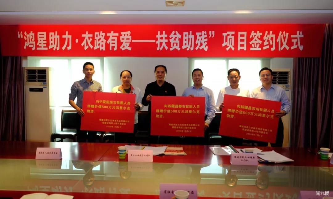 11月4日,由福建省殘疾人福利基金會(huì)、福建鴻星爾克體育用品有限公司主辦的“鴻星助力·衣路有愛——扶貧助殘項(xiàng)目”捐贈(zèng)福建省省對(duì)口支援西藏昌都、新疆昌吉、寧夏固原簽約儀式在福州舉行。福建省社會(huì)組織管理局局長(zhǎng)郭奇,福建省殘聯(lián)理事長(zhǎng)邵旭、教就部副部長(zhǎng)游水平,福建省殘疾人福利基金會(huì)理事長(zhǎng)劉新明、副理事長(zhǎng)陳振環(huán)、副秘書長(zhǎng)余一瀾及福建省第九批援藏工作隊(duì)、福建省對(duì)口支援新疆工作前方指揮部、福建省第十一批援寧工作隊(duì)相關(guān)代表出席儀式。