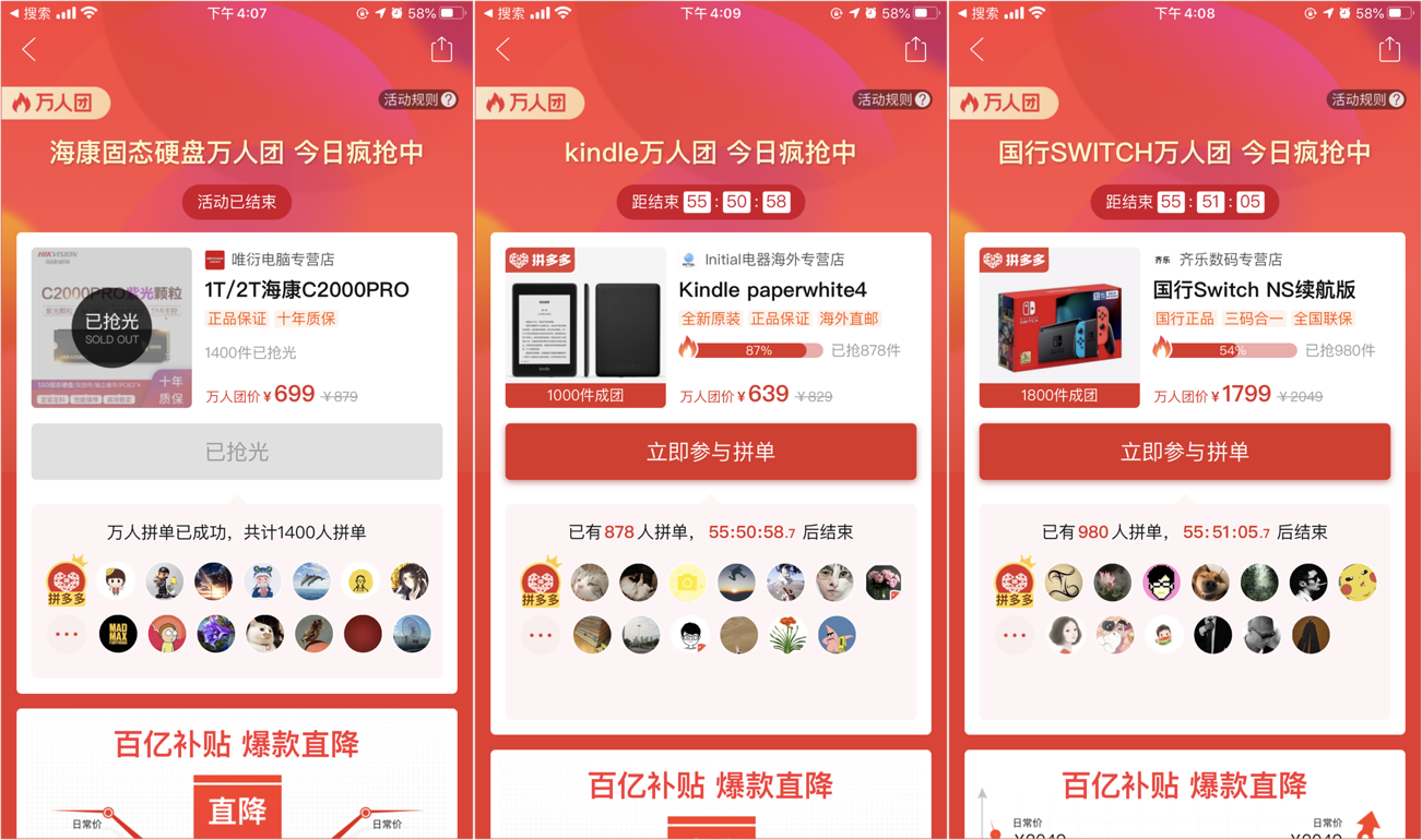 ▲多款品牌熱門商品登陸拼多多萬人團,其中??低暪虘B(tài)硬盤的數(shù)碼產(chǎn)品午夜十二點上線萬人團后,10秒鐘內(nèi)即被超額搶購 “百億補貼”是拼多多于2019年6月上線的常設(shè)性購物補貼產(chǎn)品,迄今為止,已經(jīng)連續(xù)補貼超過200天,創(chuàng)造了電商行業(yè)的新紀錄,2019年,拼多多百億補貼入口售出了超過200萬臺蘋果手機。 此前,有媒體報道顯示,拼多多平臺的百億補貼入口活躍用戶數(shù)已經(jīng)超過1億,平均每天有數(shù)千萬人通過“百億補貼”入口挑選包括蘋果手機、海藍之謎在內(nèi)的大牌商品,據(jù)媒體按照客流量測算,相當于142家北京SKP商場連續(xù)搞了近300天店慶活動,和1312座“常年全場七折”的中關(guān)村電腦城。 宗輝表示,“百億補貼節(jié)”是對百億補貼活動的一次加碼升級,旨在通過更大力度的補貼促銷,以適應消費者過去一個月無法滿足的消費需求,在復工期到來時,第一時間享受全品類品牌商品的折扣。 |