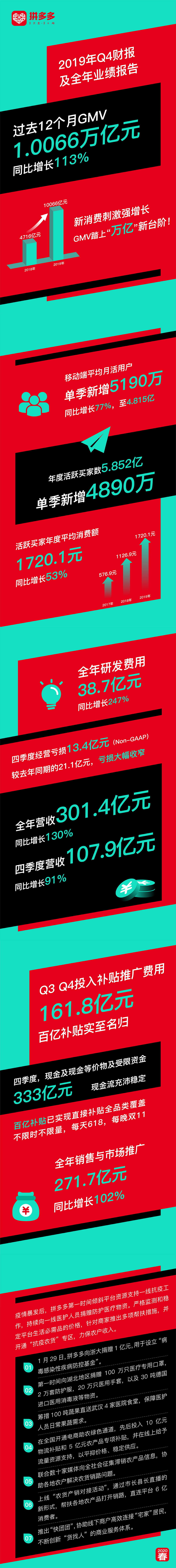 成交額破萬億 用戶年平均消費額1720元同比增長53% 財報顯示,2019年四季度,拼多多活躍用戶規(guī)模和用戶粘性繼續(xù)保持強勁增長。 截至2019年底,拼多多年活躍買家數(shù)達5.852億,單季度凈增4890萬,較上一年同期凈增1.67億。2019年Q3及Q4兩個季度,拼多多活躍買家數(shù)凈增1.02億,全網(wǎng)全域用戶的覆蓋率仍在提速增長。 基于更強的業(yè)務(wù)和產(chǎn)品創(chuàng)新能力,拼多多持續(xù)完善中國不同地區(qū)的消費平權(quán)體系,加大商品的有效供給率,推動內(nèi)需市場實現(xiàn)穩(wěn)定增長。 2019年,在持續(xù)性模式和產(chǎn)品創(chuàng)新的帶動下,平臺的用戶粘性不斷攀升。四季度,拼多多APP平均月活用戶數(shù)達4.815億,單季度凈增5190萬,較上一年同期凈增2.09億。2019年Q3及Q4兩個季度,拼多多月活躍用戶凈增1.16億。 基于用戶規(guī)模與活躍度的強勁增長,平臺不斷完善商家效率模式,建立健全更具結(jié)構(gòu)性成本優(yōu)勢的商業(yè)生態(tài)體系。2019年,在堅決貫徹“同品更低價”策略,以及創(chuàng)新定制化產(chǎn)品持續(xù)豐富的帶動下,拼多多活躍買家的年平均消費額進一步增長至1720.1元,較上一年同期的1126.9元增長53%。 在活躍買家數(shù)和年平均消費額的雙重推動下,2019年,拼多多實現(xiàn)GMV10066億元,較上一年的4716億元同比增長113%。 國家統(tǒng)計局公布的數(shù)據(jù)顯示,2019年,中國網(wǎng)上商品零售額為106324億元,同比增長16.5%。上述數(shù)據(jù)表明,在萬億體量的基礎(chǔ)上,拼多多的增速依舊近7倍于行業(yè)平均增速。同時,創(chuàng)立不足5年的拼多多,也成為突破萬億成交額最快的電商平臺。 履行5.85億用戶物資保障 全球集采馳援抗疫前線 經(jīng)過近5年的發(fā)展,拼多多有能力以更大的規(guī)模、更強的組織應(yīng)變能力,去承受未知的挑戰(zhàn),有效履行企業(yè)社會責任。 “新冠疫情”爆發(fā)后,拼多多肩負巨大的責任和壓力,努力平抑物價、保障供給,為平臺5.852億用戶以及全民抗疫工作提供必要的支持與幫助。 作為電商平臺,特殊時期最有效的履責方式,是維系上下游的正常運轉(zhuǎn),一方面幫助上游的農(nóng)業(yè)生產(chǎn)者和制造企業(yè)渡過難關(guān),另一方面全力滿足消費者在特殊時期的基本生活保障。 1月23日,拼多多全網(wǎng)率先上線“抗疫專區(qū)”,設(shè)立6億元應(yīng)急資金,對疫情防控相關(guān)的醫(yī)療衛(wèi)生用品進行全面覆蓋。同時,拼多多積極協(xié)調(diào)國內(nèi)醫(yī)療衛(wèi)生用品生產(chǎn)資源,統(tǒng)籌調(diào)度國際醫(yī)療資源,確??挂邞?yīng)急用品以全網(wǎng)低價的形式維持足量供給。 截至2月底,拼多多“抗疫專區(qū)”累積補貼超過1.8億件抗疫防護用品。此外,拼多多還聯(lián)合湖北省新冠肺炎疫情防控指揮部指定銷售渠道,向湖北地區(qū)每天定向提供300萬只、售價不足2元的一次性口罩。隨著全國性大復工的到來,目前,拼多多的口罩日供應(yīng)量已經(jīng)攀升至1000萬只。 為維持特殊時期商品供應(yīng)的穩(wěn)定有序,幫助平臺生態(tài)內(nèi)的商家共克時艱,疫情期間,拼多多對每一位堅持服務(wù)消費者的商家進行資金支持。1月底,平臺首批劃撥10億元專項資金,為每一筆發(fā)貨的訂單提供2至4元的專項補貼,以激勵商家保障消費者物資需求,降低商家的運營和現(xiàn)金流壓力。 除努力上下游供需體系正常運轉(zhuǎn),拼多多還積極馳援抗疫前線,為全民抗疫提供力所能及的幫助。 1月29日,拼多多捐贈1億元資金,聯(lián)合浙江大學共同成立“病毒感染性疾病防控專項基金”,用于支持病毒感染和呼吸道疾病的預防和控制研究。該基金由十余位院士、教授和一線醫(yī)生組成專家委員會主導,主要支持應(yīng)對“新冠疫情”的支援保障和科學研究工作,并獎勵為抗擊疫情做出重大貢獻的醫(yī)護人員。 同時期,拼多多還通過全球集采的方式,馳援湖北等抗疫前線。1月底開始,拼多多便成立抗疫工作組,針對重點抗疫前線展開立體式、多樣化的援助。期間,拼多多先后調(diào)配德國、俄羅斯、阿聯(lián)酋等十多個國家和地區(qū)的國際醫(yī)療資源,累積向武漢、黃岡、孝感等地區(qū)捐贈超過100萬只醫(yī)療專用口罩、2.5萬套防護服等物資,并響應(yīng)93家各地組織和機構(gòu)的求助,以“點對點”捐助的形式將救援物資運送到前線急需單位。 年營收突破300億元 “百億補貼”超額兌現(xiàn) 財報顯示,2019年四季度,平臺實現(xiàn)營收107.9億元,較上一年同期的56.5億元同比增長91%。2019年全年,平臺實現(xiàn)營收301.4億元,較上一年同期的131.2億元同比增長130%。 營收增長主要源自平臺在線營銷技術(shù)服務(wù)收入的強勁增長。四季度,平臺在線營銷技術(shù)服務(wù)收入為96.9億元,較上一年同比增長91%。2019年全年,平臺在線營銷技術(shù)服務(wù)收入為268.1億元,較上一年同比增長133%。 2019年,拼多多不斷加大對于商家的支持力度,平臺始終堅持“0傭金”政策,除支付給支付機構(gòu)的千分之六手續(xù)費外,平臺不向商家收取任何傭金,并針對優(yōu)質(zhì)優(yōu)價的商品提供足量的免費流量扶持。 完善的商家策略有效提升了平臺的商品競爭力,在此基礎(chǔ)上,拼多多還通過平臺直接補貼的方式,繼續(xù)加大對于優(yōu)質(zhì)品牌和商品的支
