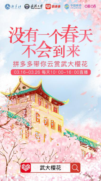 東南網3月17日訊(本網記者 陳楠)武漢的疫情尚未徹底結束,但櫻花已經如期盛開。從3月16日起直到3月26日,拼多多將連續(xù)11天,通過多多直播的方式,聯(lián)合武漢大學、新華社、咪咕等平臺從每天早上10點到下午4點,為平臺5.85億用戶開啟在線“云賞櫻”的窗口。 用戶只需在拼多多APP里搜索“武大櫻花”,就能直抵武漢大學櫻花盛開的校園,欣賞春天里的絢爛美景。用戶還能在相關專題頁面,下單購買櫻花酥等應景的武漢特產。