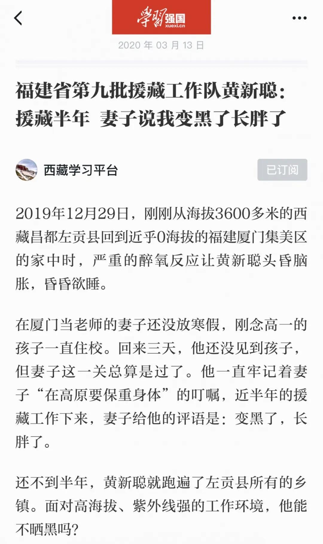 編者按:3月13日,“學(xué)習(xí)強(qiáng)國”平臺(tái)報(bào)道閩九援隊(duì)員《福建省第九批援藏工作隊(duì)黃新聰:援藏半年 妻子說我變黑了長(zhǎng)胖了》。