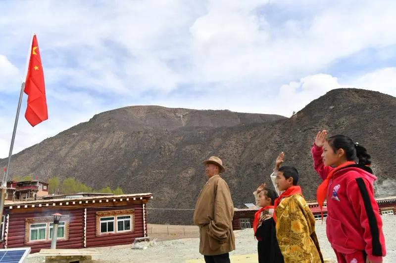 圖為普巴和孫子、孫女向國旗行禮。 1950年10月,十八軍渡過金沙江,在崗?fù)写宕蝽懥瞬紤?zhàn)役第一槍。崗?fù)写宓玫浇夥?,成為西藏第一面五星紅旗升起的地方。78歲的村民普巴,見證了當(dāng)年十八軍進(jìn)藏的歷史。解放后,他當(dāng)過兵,并在部隊(duì)里加入中國共產(chǎn)黨,退伍后還當(dāng)過崗?fù)写宕彘L。
