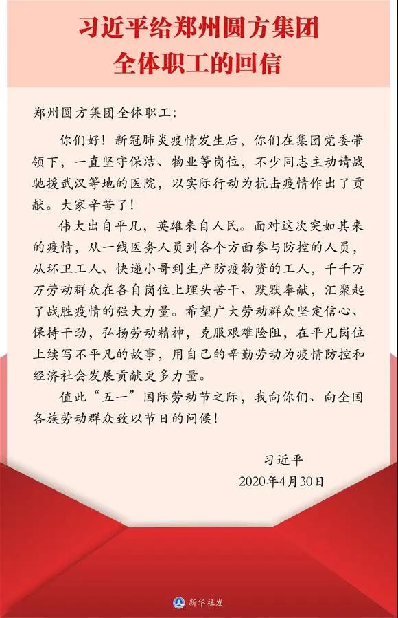 2020-05-06 16:15:10 來源:新華社 責(zé)任編輯:林晨 作者:弘揚(yáng)勞動精神 克服艱難險阻 在平凡崗位上續(xù)寫不平凡的故事 向全國各族勞動群眾致以節(jié)日的問候 在“五一”國際勞動節(jié)來臨之際,中共中央總書記、國家主席、中央軍委主席習(xí)近平4月30日給鄭州圓方集團(tuán)全體職工回信,向他們并向全國各族勞動群眾致以節(jié)日的問候。 習(xí)近平在回信中表示,新冠肺炎疫情發(fā)生后,你們在集團(tuán)黨委帶領(lǐng)下,一直堅守保潔、物業(yè)等崗位,不少同志主動請戰(zhàn)馳援武漢等地的醫(yī)院,以實際行動為抗擊疫情作出了貢獻(xiàn)。大家辛苦了! 習(xí)近平指出,偉大出自平凡,英雄來自人民。面對這次突如其來的疫情,從一線醫(yī)務(wù)人員到各個方面參與防控的人員,從環(huán)衛(wèi)工人、快遞小哥到生產(chǎn)防疫物資的工人,千千萬萬勞動群眾在各自崗位上埋頭苦干、默默奉獻(xiàn),匯聚起了戰(zhàn)勝疫情的強(qiáng)大力量。希望廣大勞動群眾堅定信心、保持干勁,弘揚(yáng)勞動精神,克服艱難險阻,在平凡崗位上續(xù)寫不平凡的故事,用自己的辛勤勞動為疫情防控和經(jīng)濟(jì)社會發(fā)展貢獻(xiàn)更多力量。 圓方集團(tuán)是河南省鄭州市一家綜合服務(wù)型民營企業(yè),現(xiàn)有員工6萬人,其中黨員500多名。近日,黨的十九大代表、圓方集團(tuán)黨委書記薛榮給習(xí)近平總書記寫信,代表全體職工匯報了堅守本職崗位、積極參與抗疫的情況,表達(dá)了共擔(dān)責(zé)任、共克時艱的決心。
