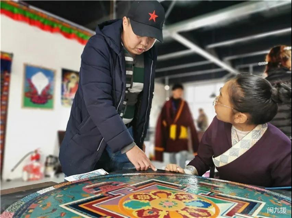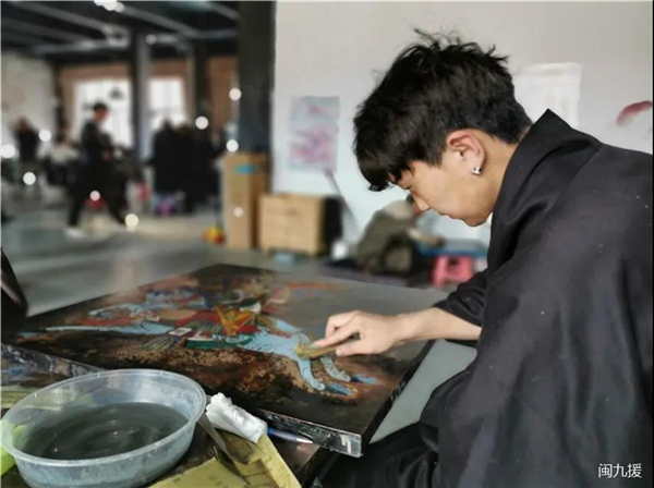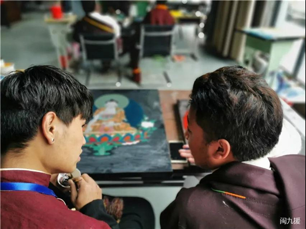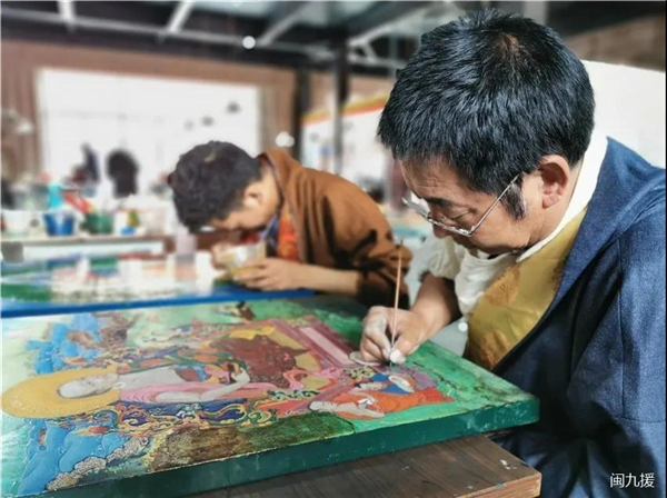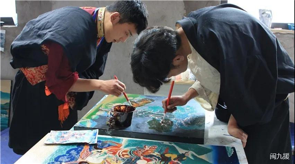 本次直播活動由福建省文化和旅游廳指導(dǎo),福建省藝術(shù)館(福建省非物質(zhì)文化遺產(chǎn)保護(hù)中心)、昌都市文化局(市文物局)、福建省第九批援藏工作隊(duì)主辦,昌都市新區(qū)管委會協(xié)辦,海峽教育報承辦。 2019年,福建省第九批援藏工作隊(duì)會同福建省文旅廳、福建省藝術(shù)館和昌都市文化局聯(lián)合組建了“唐卡漆畫文化產(chǎn)業(yè)小組團(tuán)”,選取昌都市唐卡藝術(shù)傳承人和唐卡畫師為重點(diǎn)培訓(xùn)對象,教授運(yùn)用漆畫技藝制作唐卡作品。今年5月,昌都市首屆唐卡漆畫技藝培訓(xùn)班在西藏昌都開班,37名學(xué)員經(jīng)過40天培訓(xùn),將創(chuàng)作一批以昌都解放70周年為主題的唐卡漆畫作品,為昌都解放70周年獻(xiàn)禮。 培訓(xùn)班既是福建藝術(shù)扶貧工程打造的農(nóng)民漆畫創(chuàng)新實(shí)踐的升級版,也是福建省第九批援藏工作隊(duì)按照中組部精準(zhǔn)實(shí)施“小組團(tuán)”援藏工作的要求,采取“短小精專”的組團(tuán)方式,找準(zhǔn)切入點(diǎn),解決問題,填補(bǔ)行業(yè)空白創(chuàng)新的“福建經(jīng)驗(yàn)”和“福建模式”