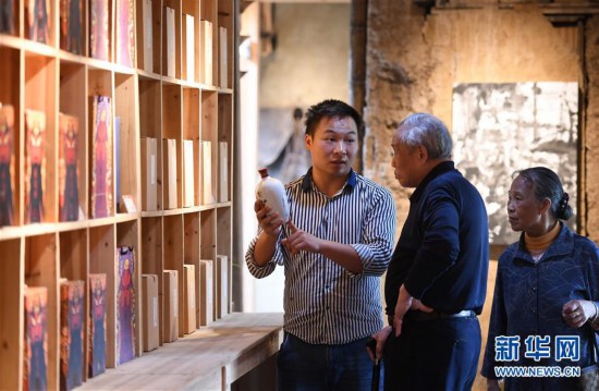 來(lái)自江西的“新村民”肖繼河(左一)在龍?zhí)洞宓木撇┪镳^向游客介紹龍?zhí)洞宓膫鹘y(tǒng)米酒(6月12日攝)。 新華社記者 林善傳 攝