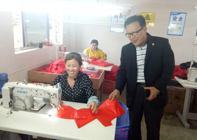 李然(右)看望在芙蓉制衣間工作的貧困戶胡愛珍(新華社 熊鵬 5月7日攝)