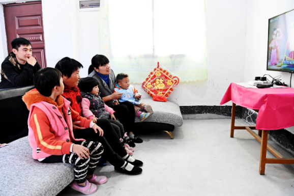 貧困戶一家人在新房中觀看春節(jié)聯(lián)歡晚會