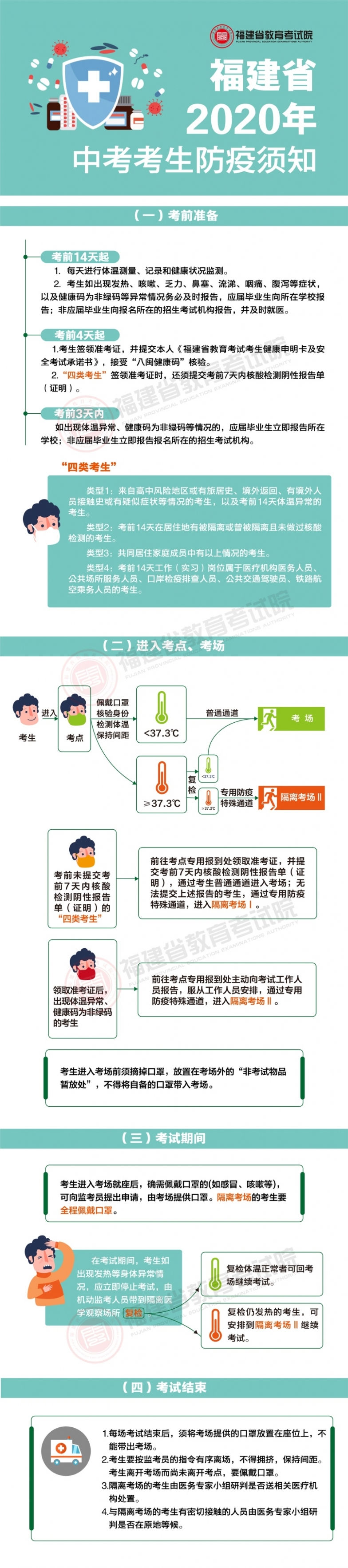 為讓廣大考生充分知曉2020年我省中考防疫工作要求,根據(jù)教育部、國家衛(wèi)健委和省教育廳、省衛(wèi)健委關(guān)于新冠肺炎疫情防控常態(tài)化下教育考試防疫工作指導意見,福建省教育考試院制作了《福建省2020年中考考生防疫須知》,通過圖解方式對考生考前、考中、考后等各環(huán)節(jié)的防疫要求進行詳細說明。