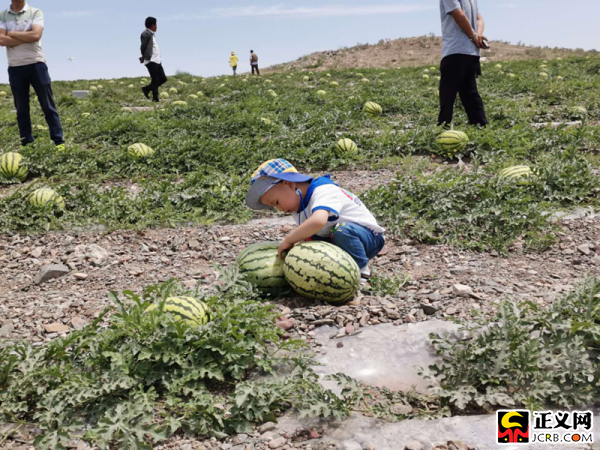 喊叫水鄉(xiāng)硒砂瓜成熟時節(jié),村民帶著孩子來田地里忙碌和查看。崔曉麗 攝 喊叫水村主要為黃土丘陵、河谷灘地,平均海拔在1500米,年均降水量僅250毫升左右,年蒸發(fā)量卻高達(dá)2000毫升,地下水和地表水均為苦咸水。雖然四季分明,但只能靠天收,種植小雜糧,根本談不上種植經(jīng)濟(jì)作物和發(fā)展種植產(chǎn)業(yè)。“這里最缺的是水,不缺的是窮?!焙敖兴宕逯魅涡l(wèi)平說,2005年村里的人均年收入只有500元。 窮則思變。2006年,中寧縣鄉(xiāng)兩級黨委、政府大力推行中衛(wèi)市“百萬畝硒砂瓜工程”,由政府牽頭、干部帶頭,幫助農(nóng)民種西瓜,協(xié)助農(nóng)民售西瓜,積極兌現(xiàn)種植補(bǔ)貼政策?!皠傞_始村民不理解為啥好好的土地要蓋上砂土種西瓜,我們就耐心入戶講解,讓農(nóng)民放心?!泵缧l(wèi)平說,第一年種植硒砂瓜1000畝,產(chǎn)量100萬斤,全村硒砂瓜收入實現(xiàn)20萬元,人均可支配收入實現(xiàn)了翻番。