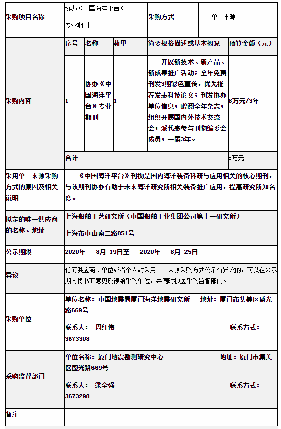 協(xié)辦《中國海洋平臺(tái)》專業(yè)期刊采用單一來源采購公示