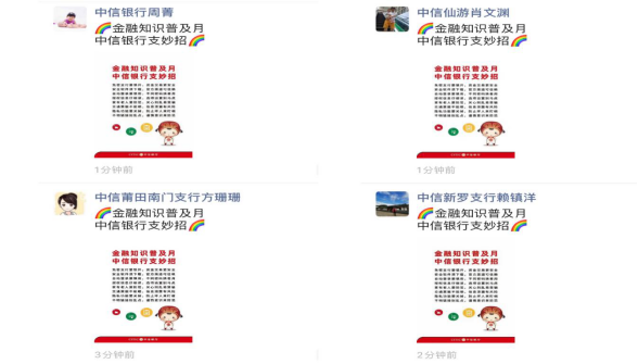 中國人民銀行福州中心支行: 根據(jù)《中國人民銀行辦公廳 中國銀行保險(xiǎn)監(jiān)督管理委員會(huì)辦公廳 中國證券監(jiān)督管理委員會(huì)辦公廳 國家互聯(lián)網(wǎng)信息辦公室秘書局關(guān)于開展2020年“金融知識普及月 金融知識進(jìn)萬家 爭做理性投資者 爭做金融好網(wǎng)民”活動(dòng)的通知》(銀辦發(fā)〔2020〕128號)的總體要求,中信銀行福州分行高度重視,立即制定活動(dòng)實(shí)施方案,組織轄內(nèi)分支行開展宣傳活動(dòng)。我行于2020年9月1日啟動(dòng)為期一個(gè)月的金融知識普及宣傳活動(dòng),現(xiàn)將第二周宣傳活動(dòng)簡報(bào)如下: 一、組織開展線上系列宣傳活動(dòng) (一)組織推送“以案說險(xiǎn)”防詐案例 本周我行組織各分支行推送的“以案說險(xiǎn)”案例以“老年人6招防范金融詐騙”為主題,通過漫畫案例的形式,提醒老年朋友不要隨意丟棄含有個(gè)人信息的物品,以免個(gè)人信息外泄,造成賬戶資金的損失;當(dāng)接到子女親友遭遇意外的電話時(shí),保持理智不要盲目答應(yīng)對方的要求,應(yīng)當(dāng)聯(lián)系當(dāng)事人確認(rèn)真?zhèn)?;對不合乎常理的高利率保持警惕,以免掉入非法吸?chǔ)、非法集資的陷阱中。