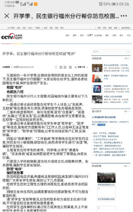 三是通過央廣網(wǎng)、央視網(wǎng)、福州晚報(bào)、東南網(wǎng)等多家網(wǎng)絡(luò)媒體平臺(tái)刊登《開學(xué)季、民生銀行福州分行幫你防范校園“電詐”》文章,普及防范校園電信詐騙知識(shí)。 三是通過央廣網(wǎng)、央視網(wǎng)、福州晚報(bào)、東南網(wǎng)等多家網(wǎng)絡(luò)媒體平臺(tái)刊登《開學(xué)季、民生銀行福州分行幫你防范校園“電詐”》文章,普及防范校園電信詐騙知識(shí)。