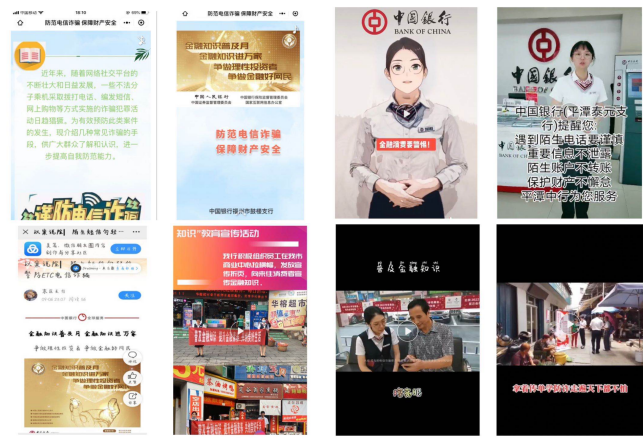 (三)充分利用新媒體社交平臺廣泛宣傳 我行轄內(nèi)各級機構利用微信、抖音、美篇、秀米、易企秀等線上新興媒體開展宣傳活動,充分發(fā)揮網(wǎng)絡陣地輻射作用,擴大宣教覆蓋面。員工拍攝短視頻,制作美篇等宣傳普及金融知識、防詐騙小知識與案例風險提示,做好線上推廣,受到客戶廣泛歡迎。宣傳周期間,轄內(nèi)分支機構制作宣傳材料,進一步擴大宣傳覆蓋面。本期截取部分宣教素材如下: 鼓樓支行《防范電信詐騙 保障財產(chǎn)安全》微信H5宣傳、南平分行《心莫貪 擦亮眼 繃根弦 防詐騙》短視頻、自貿(mào)平潭片區(qū)分行《重要信息不泄露、陌生賬戶不轉賬》短視頻、廈門分行《金融消費要警惕》抖音短視頻、自貿(mào)福州片區(qū)分行《以案說險|陌生短信勿輕信 警防ETC電信詐騙》、晉安支行《信用卡不是搖錢樹 刷卡消費要適度》、泉州分行《反賭反詐涉案賬戶風險防范》、莆田分行《拿著傳單學防詐走遍天下都不怕》等等。
