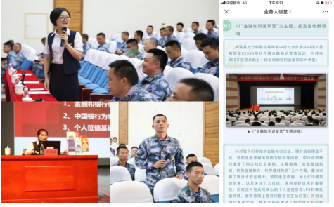 (五)因地制宜開展特色宣傳 1、閩侯南嶼中行舉行“金融知識進軍營”主題活動 閩侯南嶼中行前往部隊駐地為400多名官兵開展“金融知識進軍營”活動。針對官兵們存在的金融知識欠缺、理財規(guī)劃理念不足、預防金融詐騙風險能力較弱等問題我行精心準備了相關知識及案例,成功舉辦了一場金融知識普及講座。課上,主講人南嶼中行理財經(jīng)理圍繞 “金融基礎知識、防范金融欺詐、科學理財投資”三個方面,重點講解了銀行卡安全用卡、預防電信詐騙、網(wǎng)上P2P借貸的危害,以及關注個人征信、保持良好信用的重要性;同時對官兵所關心的個人住房貸款LPR利率批量轉換、借唄等網(wǎng)上借貸問題進行互動問答;并結合我行惠軍產(chǎn)品、基金定投等闡述了科學理財?shù)谋匾浴Vv解生動細致,內(nèi)容貼近部隊實際,官兵聽得有味、現(xiàn)場氣氛活躍。