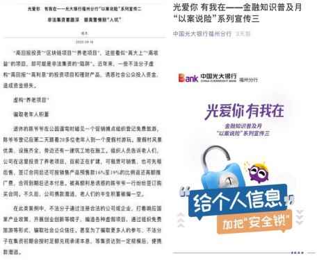 3)福州分行聯(lián)合福州晚報聯(lián)合推出“金融防詐聽我說”系列活動開啟線上宣傳,欄目共分6期。9月11日推出系列三“陌生人讓咱掏錢,沒那么容易”,9月16日推出系列四“以房養(yǎng)老的騙局”,以聲說險、立足于防、主題宣傳三大特點,每期主題配套一個典型安全,為“金融防詐”海報代言,共同宣傳發(fā)聲,目前點擊率累計達到1.08萬余人次。