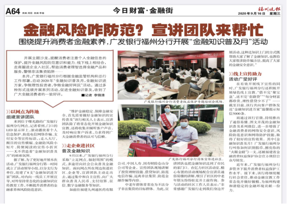 三、結合福州晚報進行宣傳 2020年9月16日,福州分行與福州晚報合作,利用福州晚報閱讀群體多的優(yōu)勢,刊登消保宣傳材料及宣傳知識,更好的普及大眾此次宣傳月以及很好地幫助客戶正確認識各類金融產品以及提供防騙指南,提高消費者金融知識水平和技能,受到消費者一致好評。