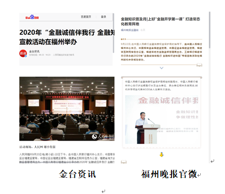 三明尤溪工行聯(lián)合縣人行開展“情系留守兒童,普及金融知識”宣傳活動 9月19日晚,莆田荔城工行在馨宜新天地參加縣人行組織的“金融知識普及月 金融知識進萬家 爭做理性投資者 爭做金融好網(wǎng)民”活動。2020年9月22日,由莆田市秀嶼區(qū)金融工作辦公室和莆田秀嶼支行牽頭組織,攜手秀嶼區(qū)各銀行機構(gòu)、秀嶼區(qū)各保險機構(gòu)共同舉辦"金融知識進萬家,爭做金融好網(wǎng)民"主題宣傳活動。