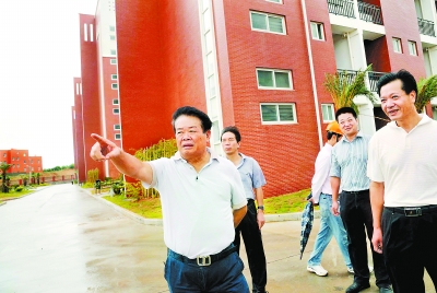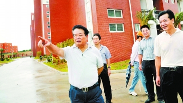 曹德旺(左一)到他捐助的中學(xué)了解校舍建設(shè)情況。福建日?qǐng)?bào)記者 游慶輝 攝