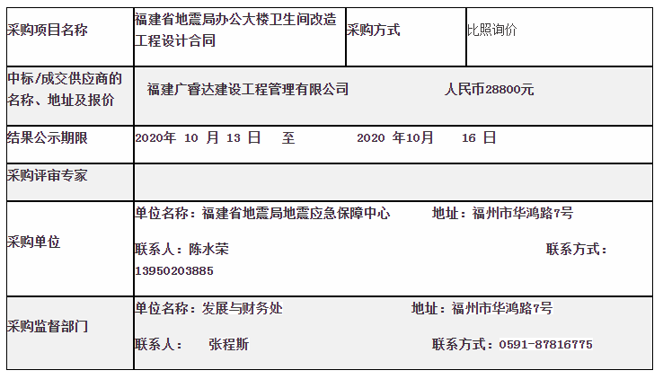 福建省地震局辦公大樓衛(wèi)生間改造工程設(shè)計(jì)采購(gòu)結(jié)果公告