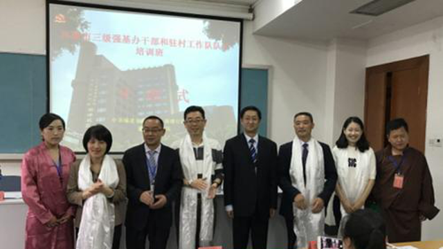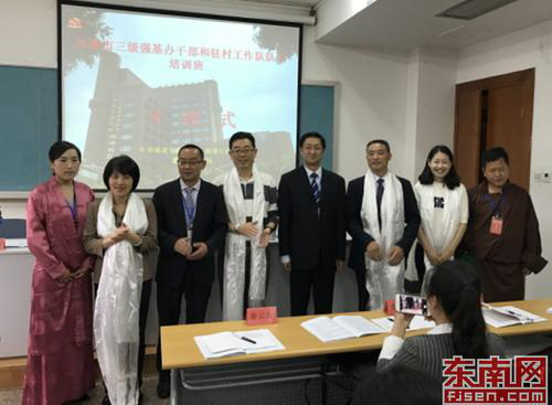 2017年4月,譚忠盛(右三)組織帶領昌都市三級強基辦帆布和駐村工作隊隊長在福建省委黨校培訓