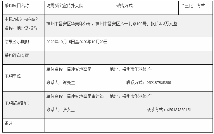 震害防御處防震減災宣傳撲克牌“采購結果公告”
