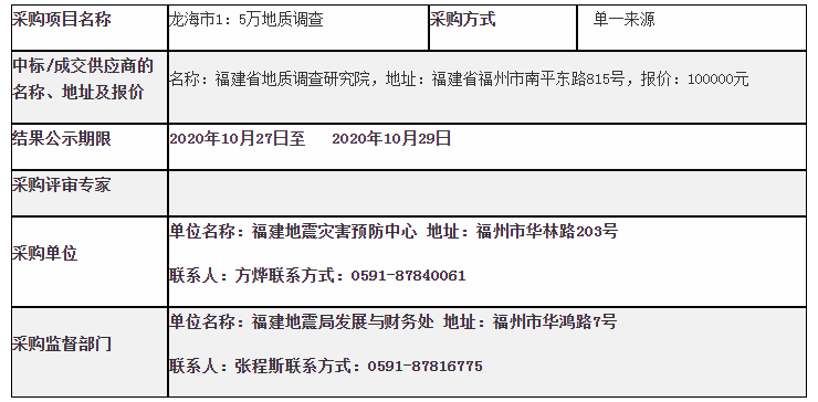 地震災(zāi)害預(yù)防中心龍海市1:5萬(wàn)地質(zhì)調(diào)查采用單一來(lái)源采購(gòu)結(jié)果公告