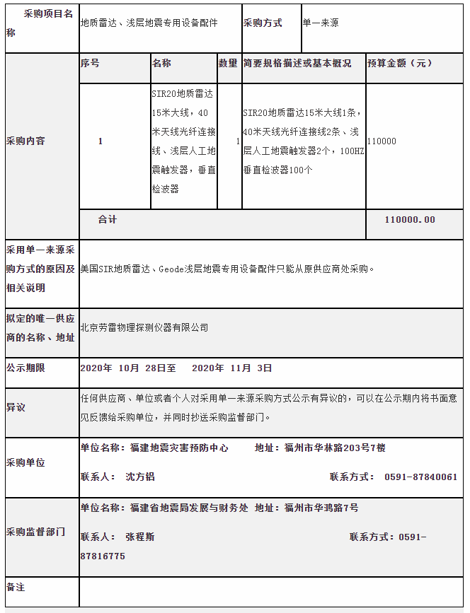 地震災(zāi)害預(yù)防中心“地質(zhì)雷達(dá)、淺層地震專用設(shè)備配件”單一來(lái)源采購(gòu)公示