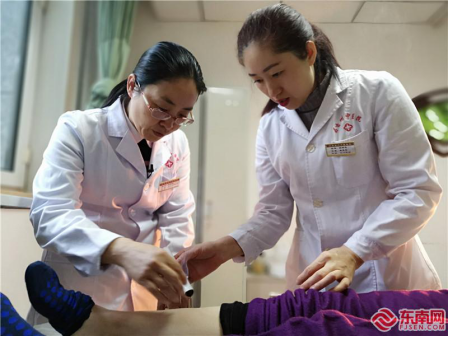 發(fā)揮“傳、幫、帶”的作用,謝雪榕手把手教徒弟針灸。 東南網(wǎng)記者 周桂枝攝