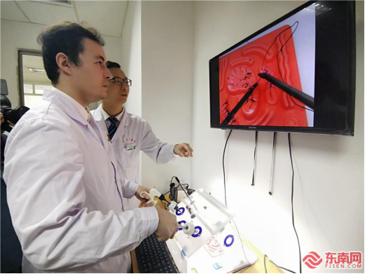 福建援疆專家徐國兵(右)指導(dǎo)伊爾夏提操作腔鏡手術(shù)模擬訓(xùn)練。 東南網(wǎng)記者 周桂枝攝