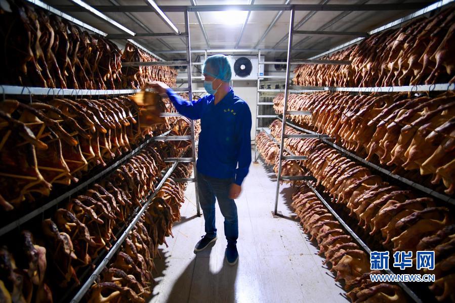 11月18日,沙縣小吃產(chǎn)業(yè)園一家企業(yè)工作人員查看庫(kù)房中的熏鴨。新華社記者 姜克紅 攝